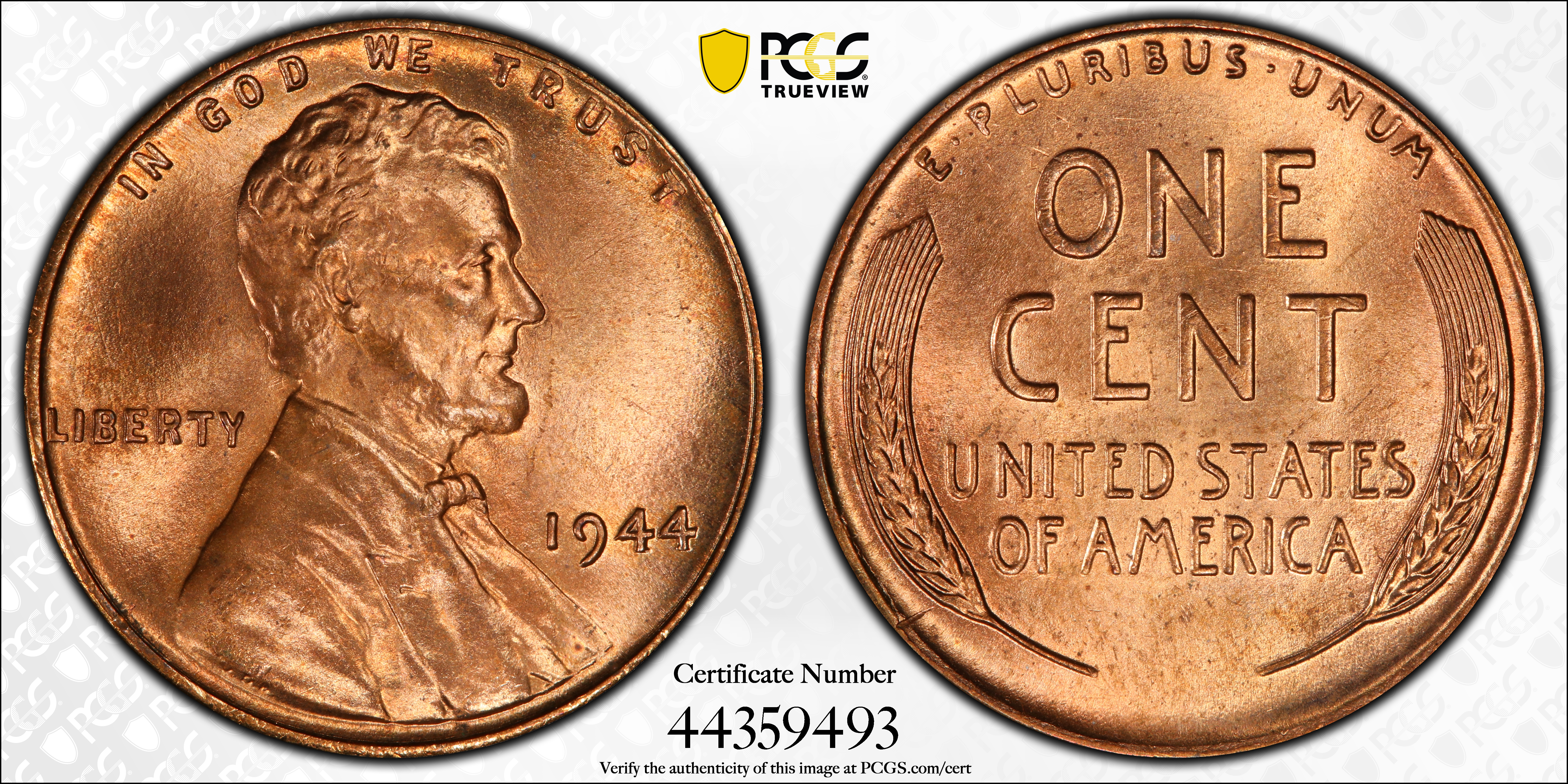 1944 1C, RD MS66RD Certification #44359493, PCGS #2722