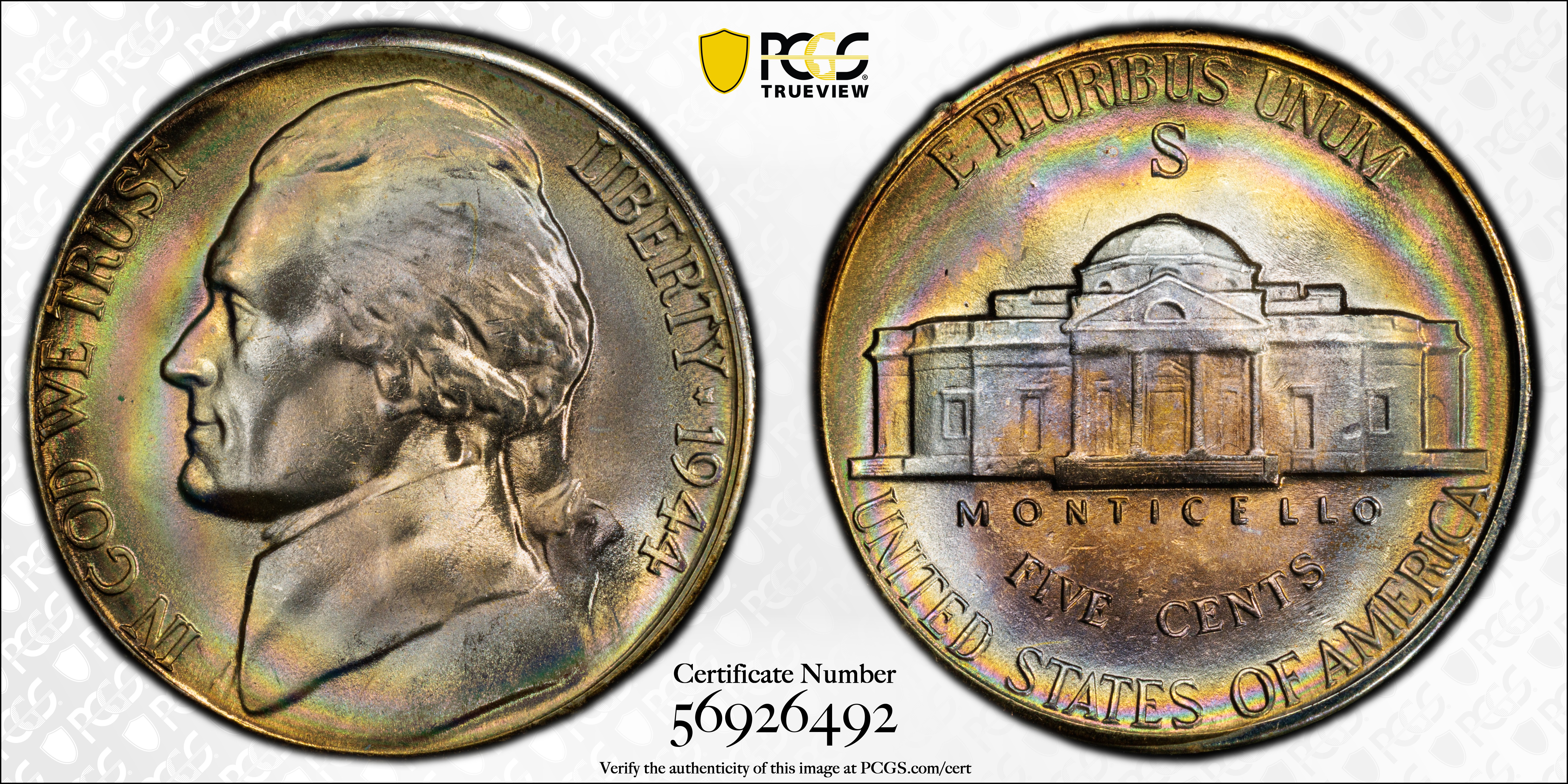 1944-S 5C MS67 Certification #56926492, PCGS #4024