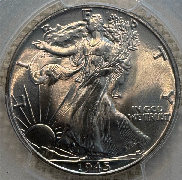 The 1945 Philadelphia is one of the most common dates in the Walking Liberty half dollar series in all grades except MS67 and MS68. This issue was saved and it comes nice. Strike is not a problem and many very frosty white Gems exist.