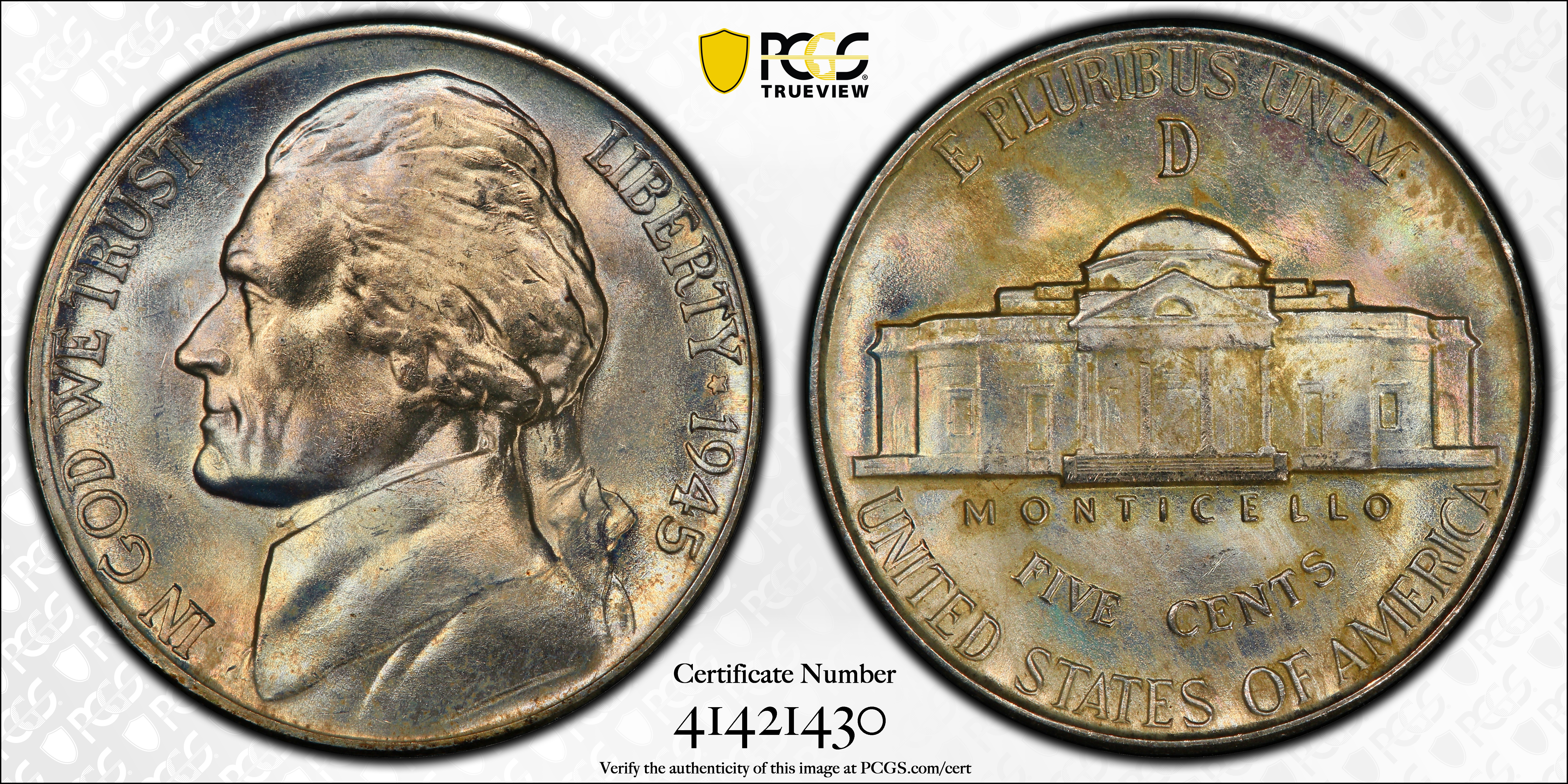 Jefferson War Nickels were struck from 1942-1945. The 1945-D Jefferson Nickel is fairly common and can be purchased very inexpensively up to about MS66 condition. In MS67 condition it becomes much scarcer especially with the Full Steps designation. In MS68 condition it is extremely scarce with less than a handful of examples graded by PCGS with no examples known in better condition.