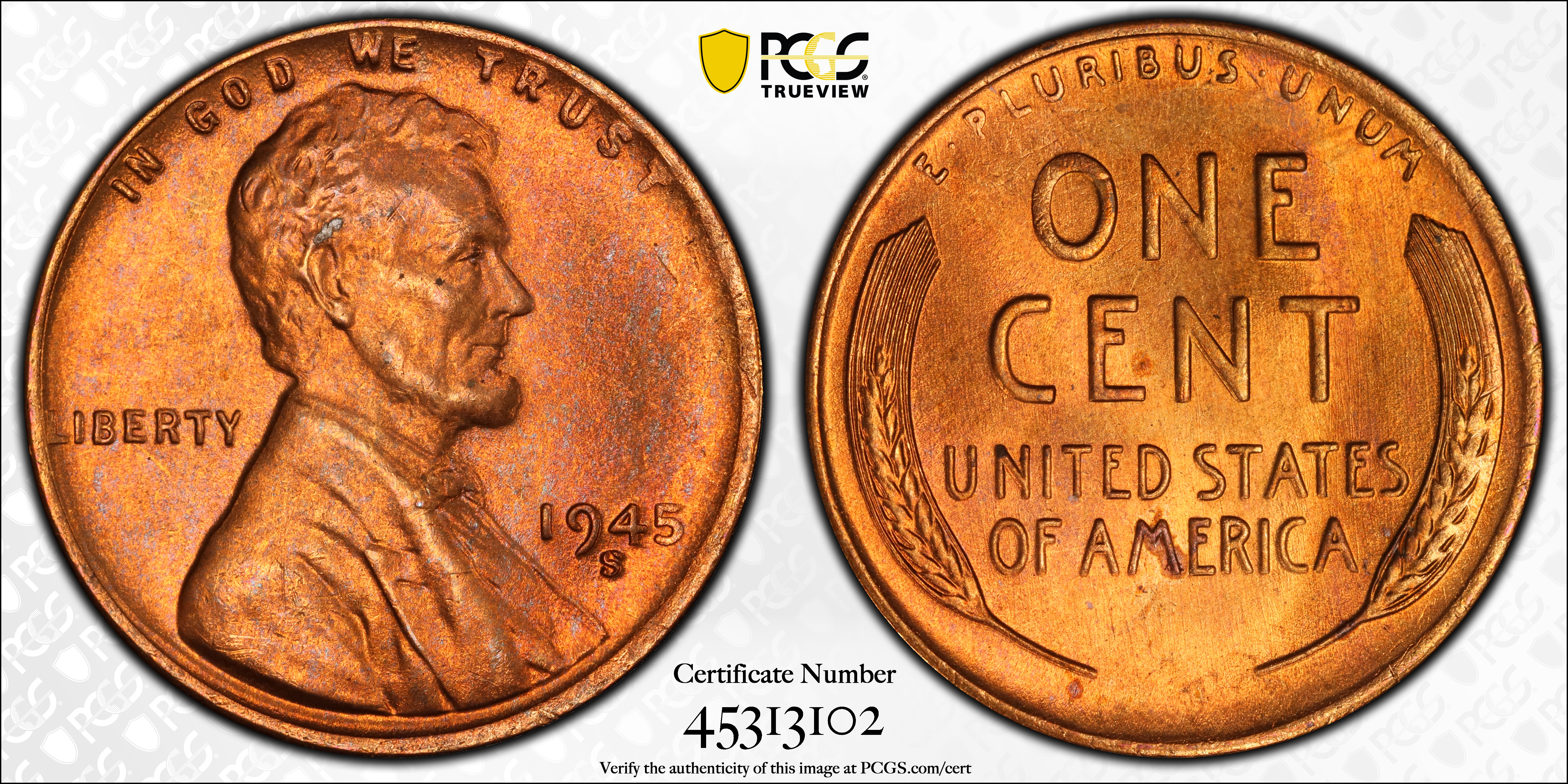 1945-S 1C, RD MS66RD Certification #45313102, PCGS #2740