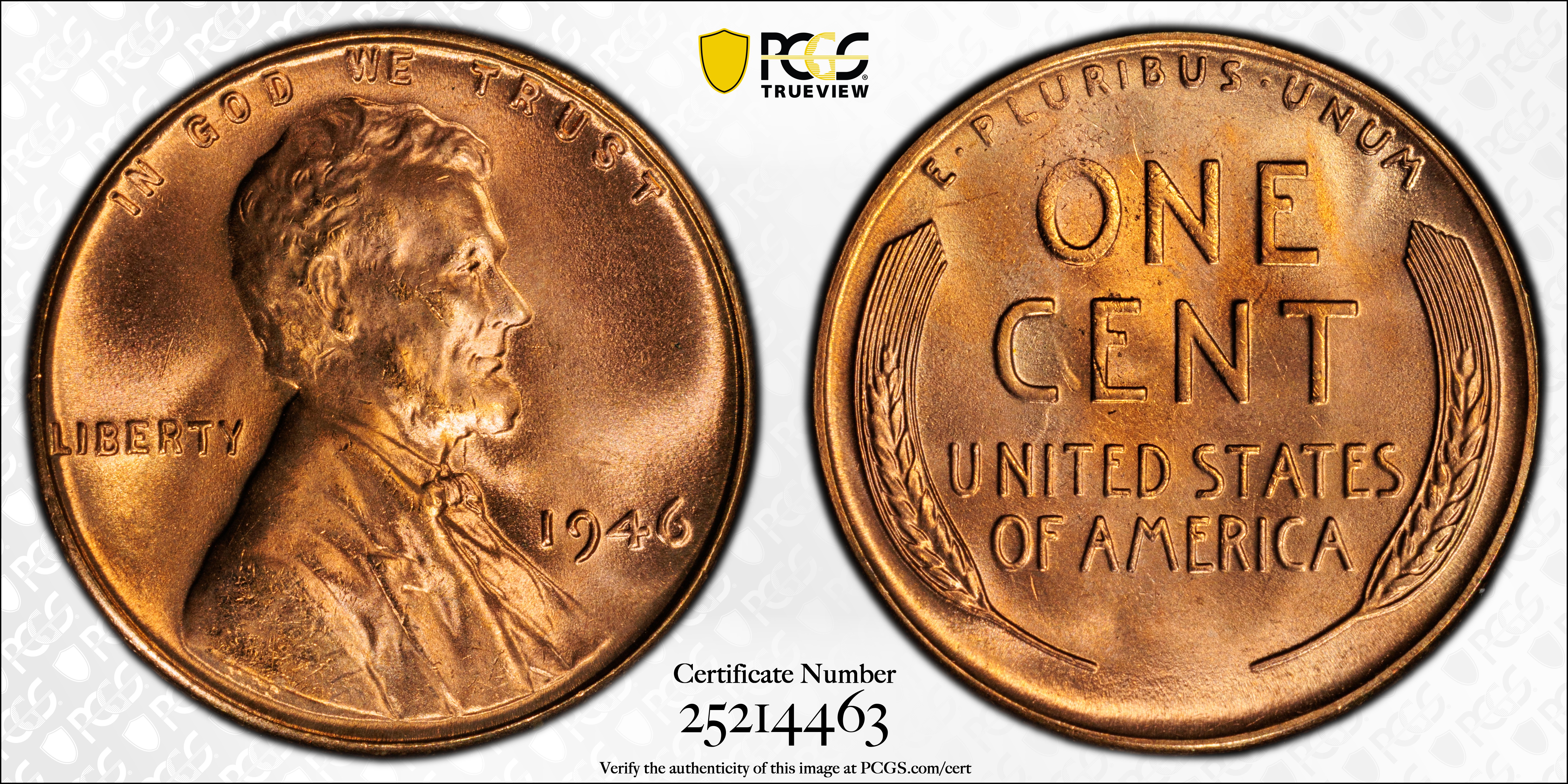 1946 1C, RD MS67RD Certification #25214463, PCGS #2743