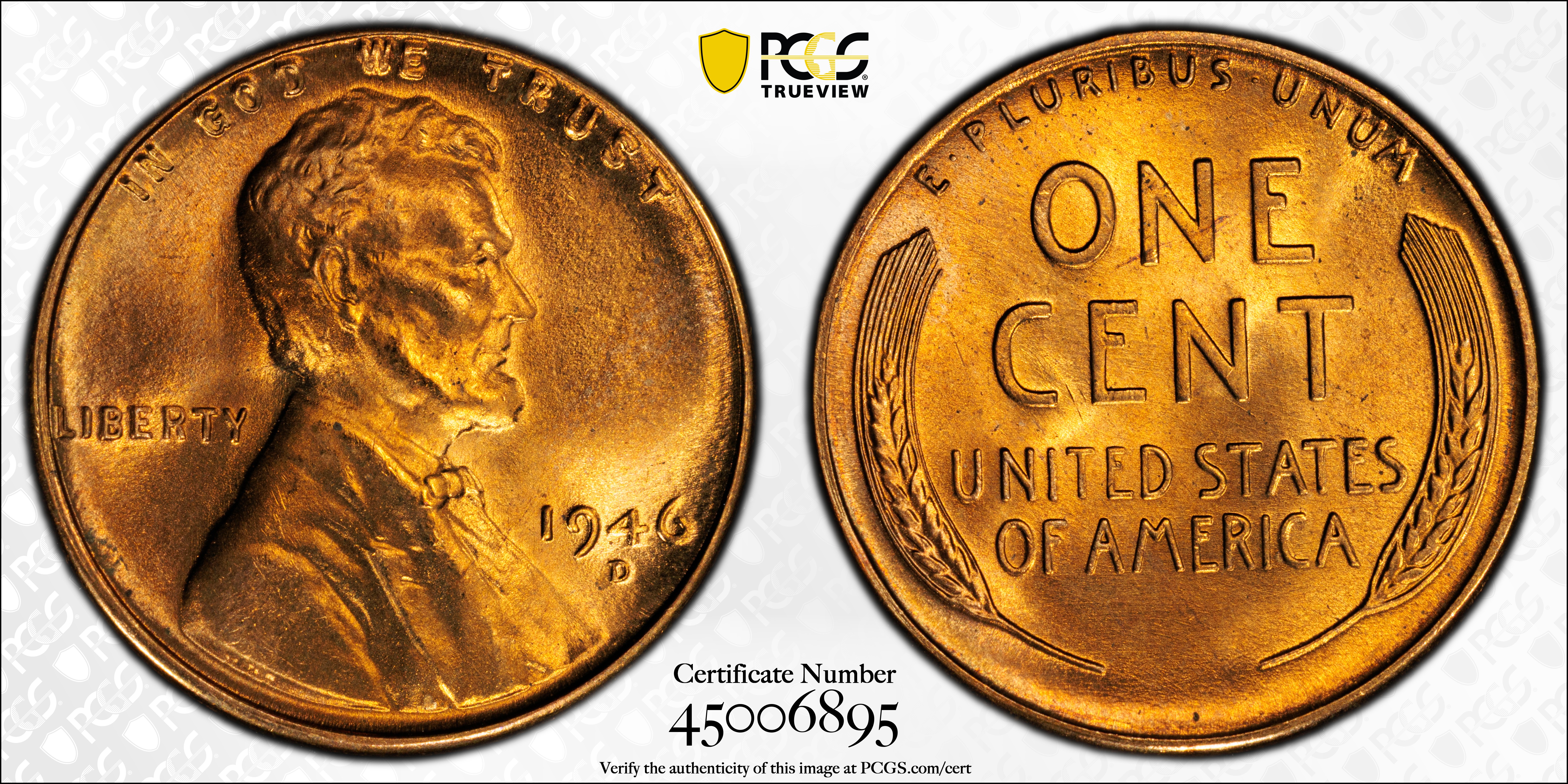 1946-D 1C, RD MS67RD Certification #45006895, PCGS #2746