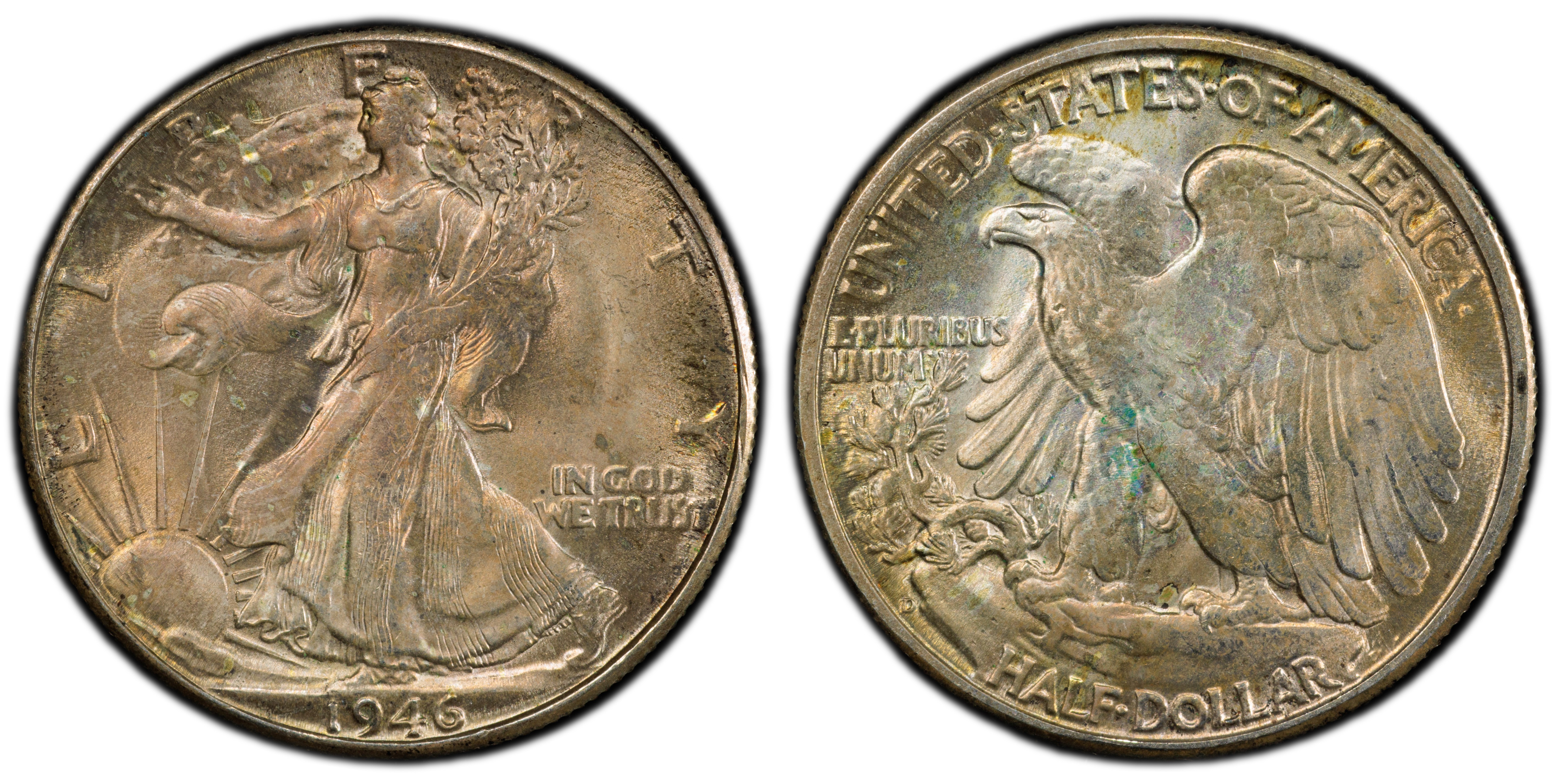 The 1946-D is the enigma of the Walking Liberty half dollar series. It is the lowest mintage of the 1939 to 1947 issues and indeed it is the hardest to find in circulated condition. Back when I was a teenager (early 1960s) and circulated rolls of post 1933 coins were a big deal, the 1946-D was a premium issue in circulated condition that traded for significantly higher price than other issues of the 1940s. But in uncirculated condition, this is the second most common Walking Liberty half dollar, with only the 1943 Philadelphia being more common. Bottom line is that a huge quantity of uncirculated rolls was saved. So this issue is very easy to locate in mint state grades up to MS65. But the enigma of the 1946-D continues for in grades above MS66 this issue is almost impossible to find. Seems that uncirculated examples were saved, including many grading MS 65, but the quality was a little off and Superb Gems are rare. This issue is usually decently struck. The look can range from frosty white (a little more satiny and subdued than earlier issue though) to various degrees of toning.