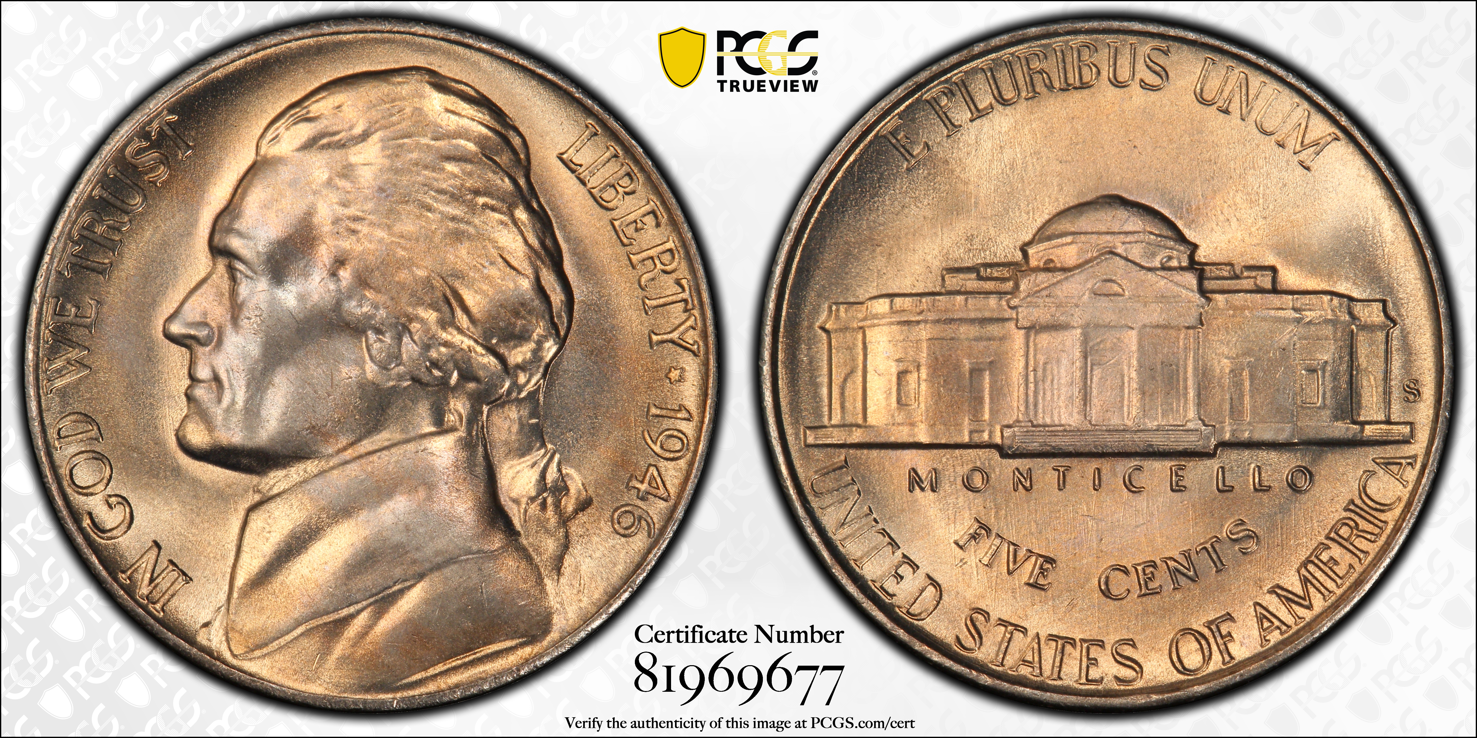 With over 13 million made, the 1946-S Nickel is a very common coin. However, fully struck examples with full steps on the reverse are a different story. Those coins represent a small portion of the overall population and they are very popular with collectors. Currently, the 1946-S Nickel with Full Steps is slightly more common then the 1946 Philadelphia issue but much less common than the 1946-D. Fortunately, many of the certified examples are in high grade and are reasonably affordable. The best example certified by PCGS is a single MS67FS.