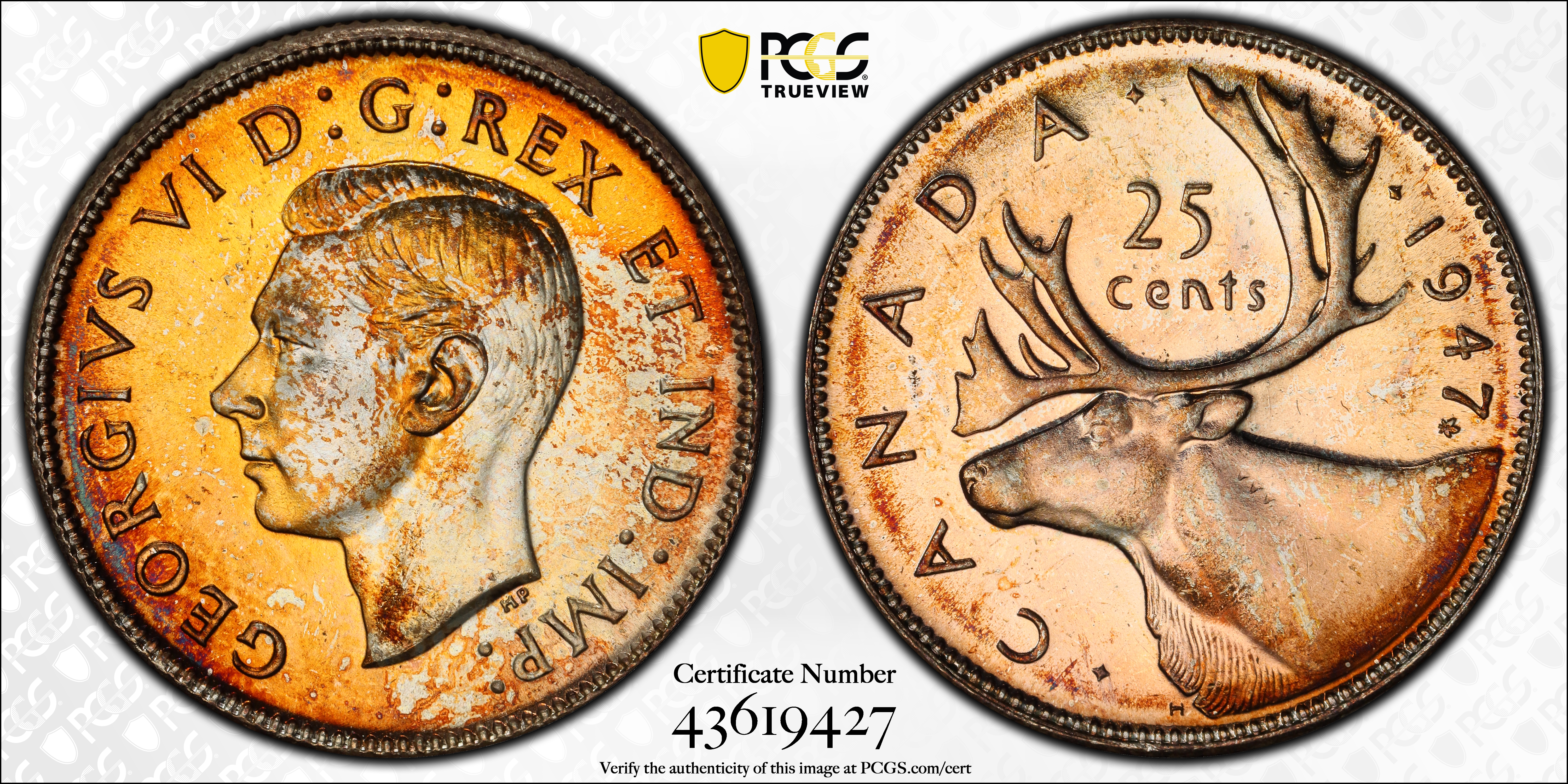1947 25C Maple Leaf MS65+ Certification #43619427, PCGS #31862