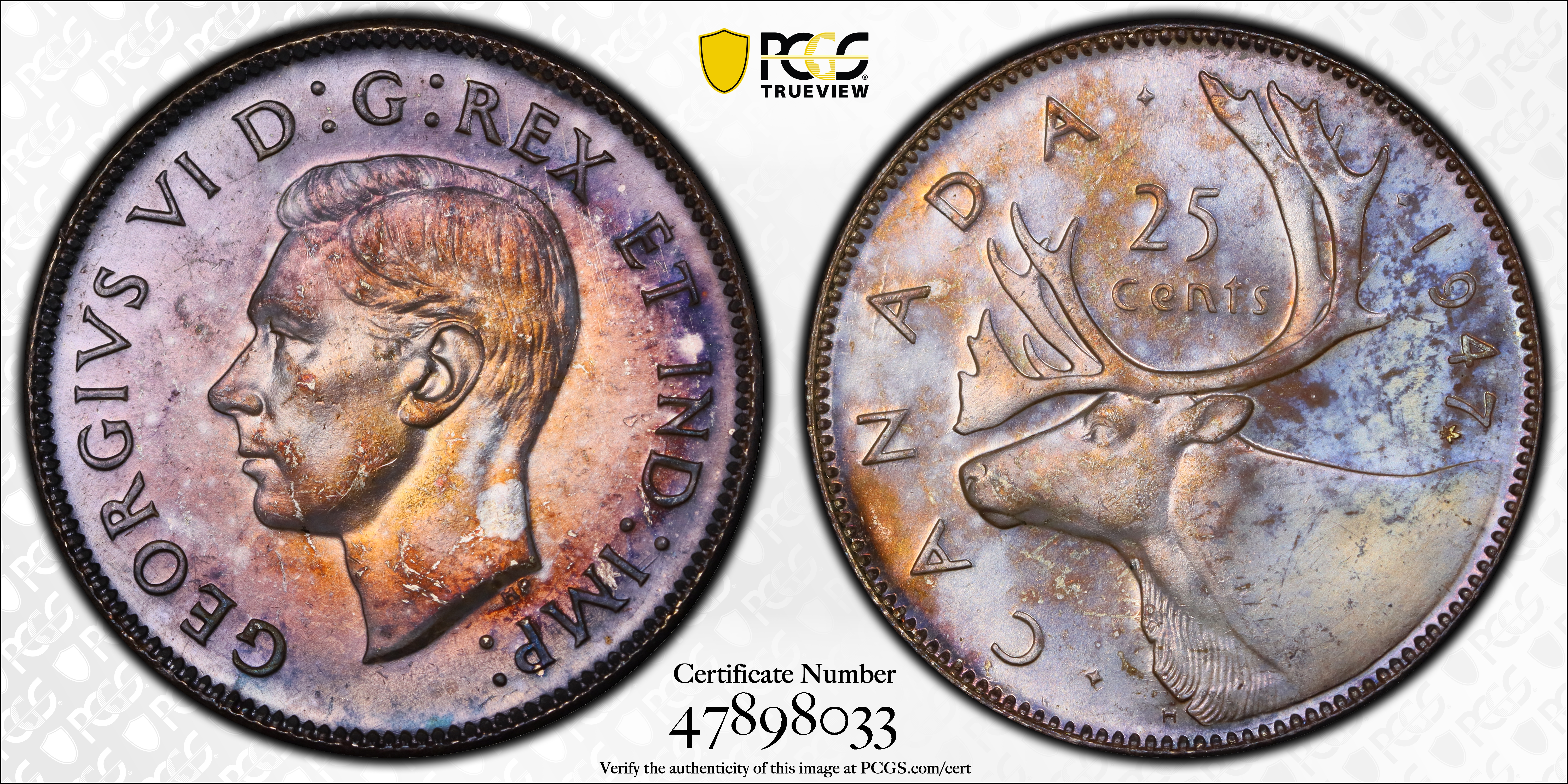 1947 25C Maple Leaf MS63 Certification #47898033, PCGS #31862
