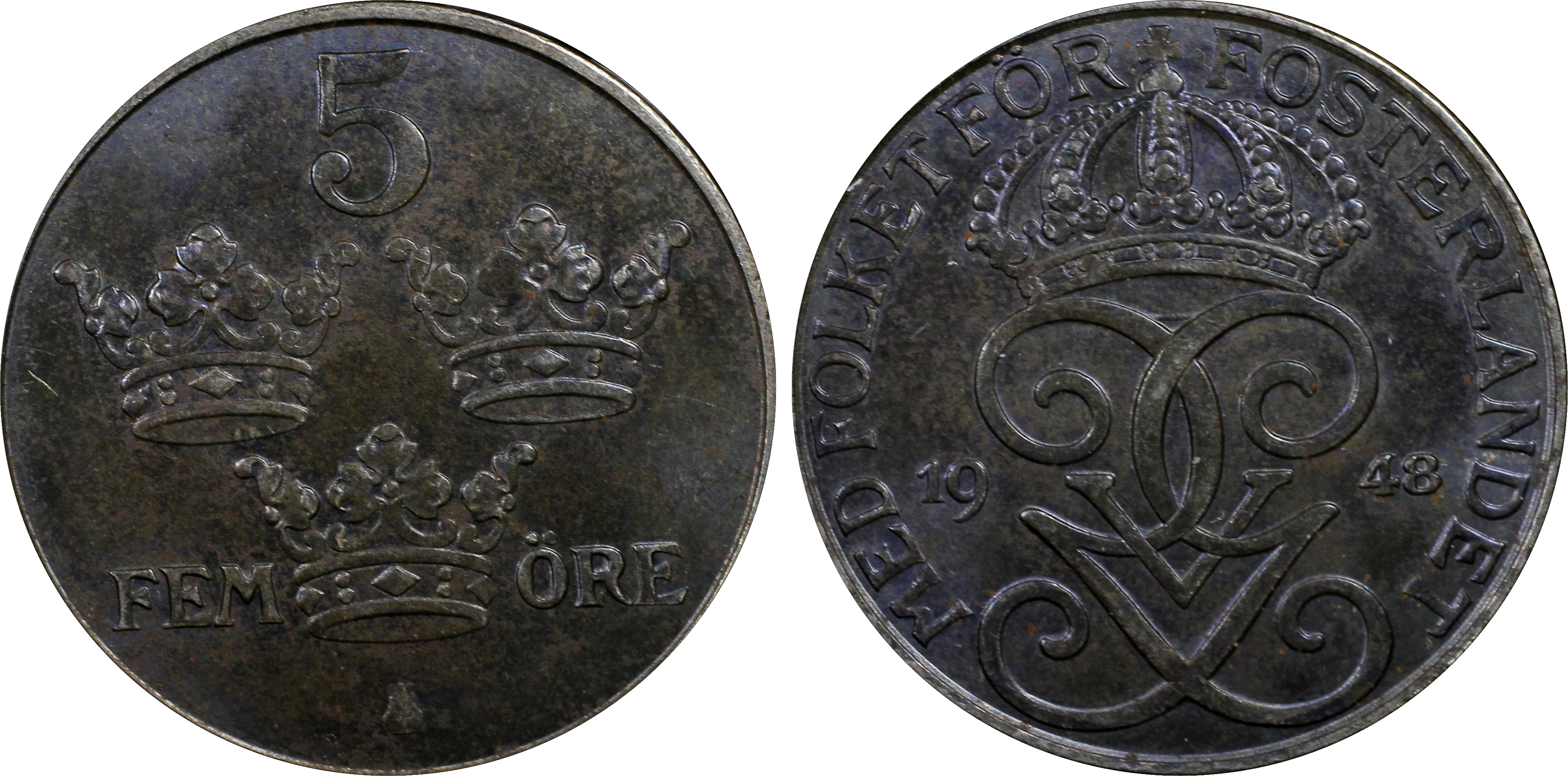 Sweden, 5 Ore Dated 1948. PCGS MS64. KM#812. World War II Issues, Iron.