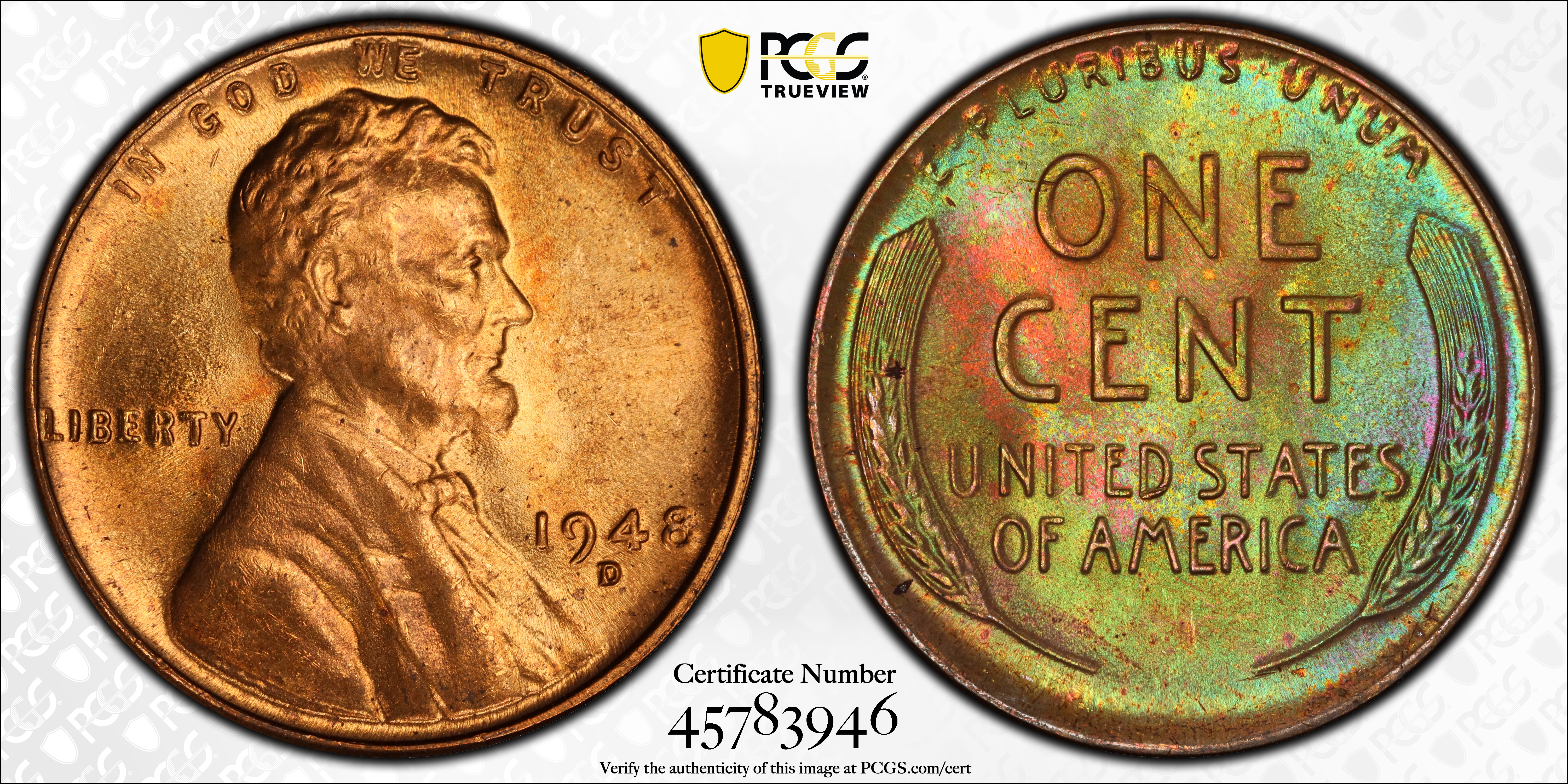 1948-D 1C, RB MS65RB Certification #45783946, PCGS #2763