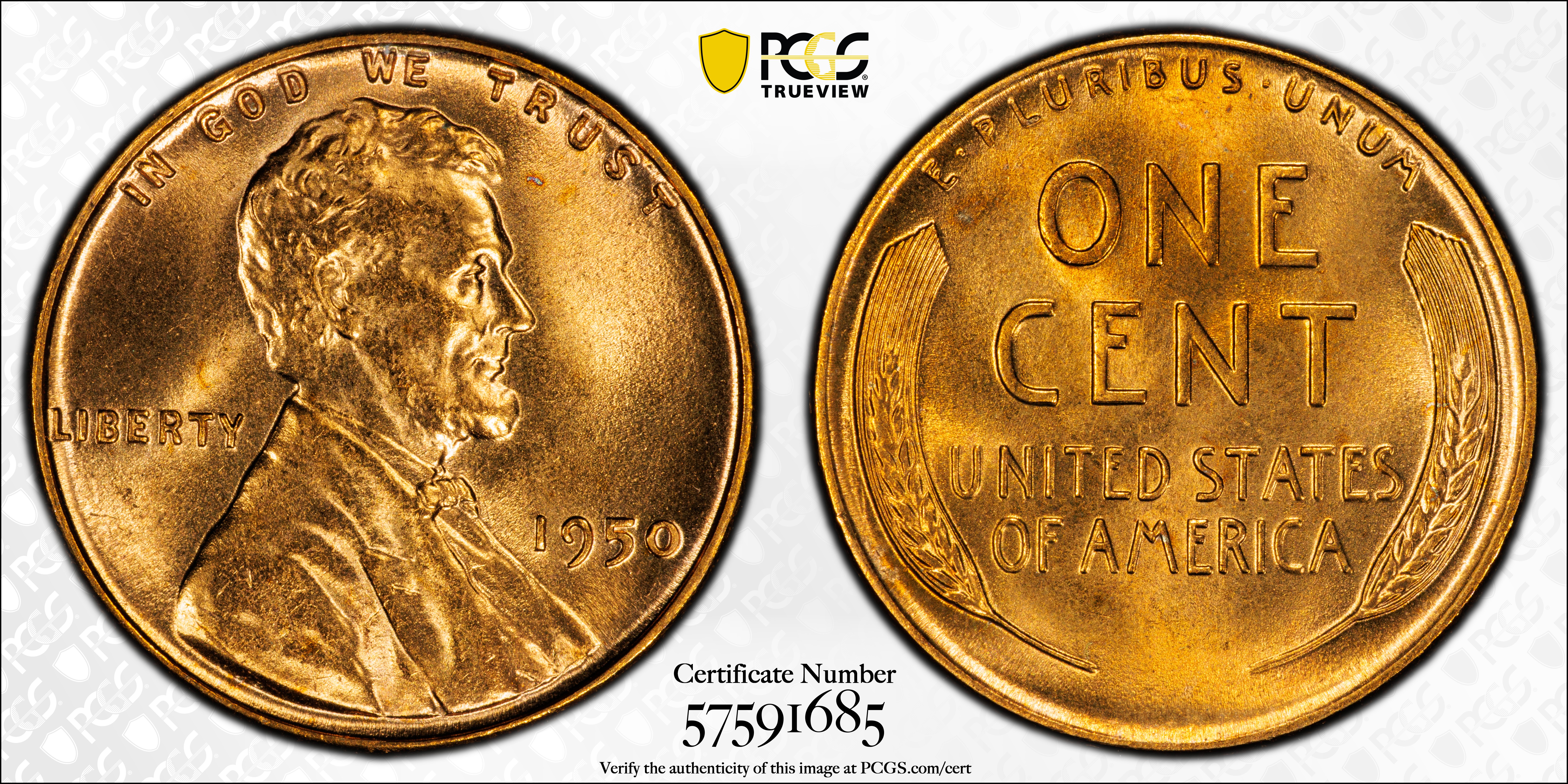 The 1950-P Lincoln cent is very difficult to find in grades of MS64 and higher. In grades of MS65 it is considered scarce. In grades of MS66 and higher it compares to the 1946P, 47P, 48P, 50P, 51P, 52P and 53P as they are all tough dates to find in high grade condition. In MS67 grades the 1950-P is extremely tough with less than 20 examples known and none being graded higher.