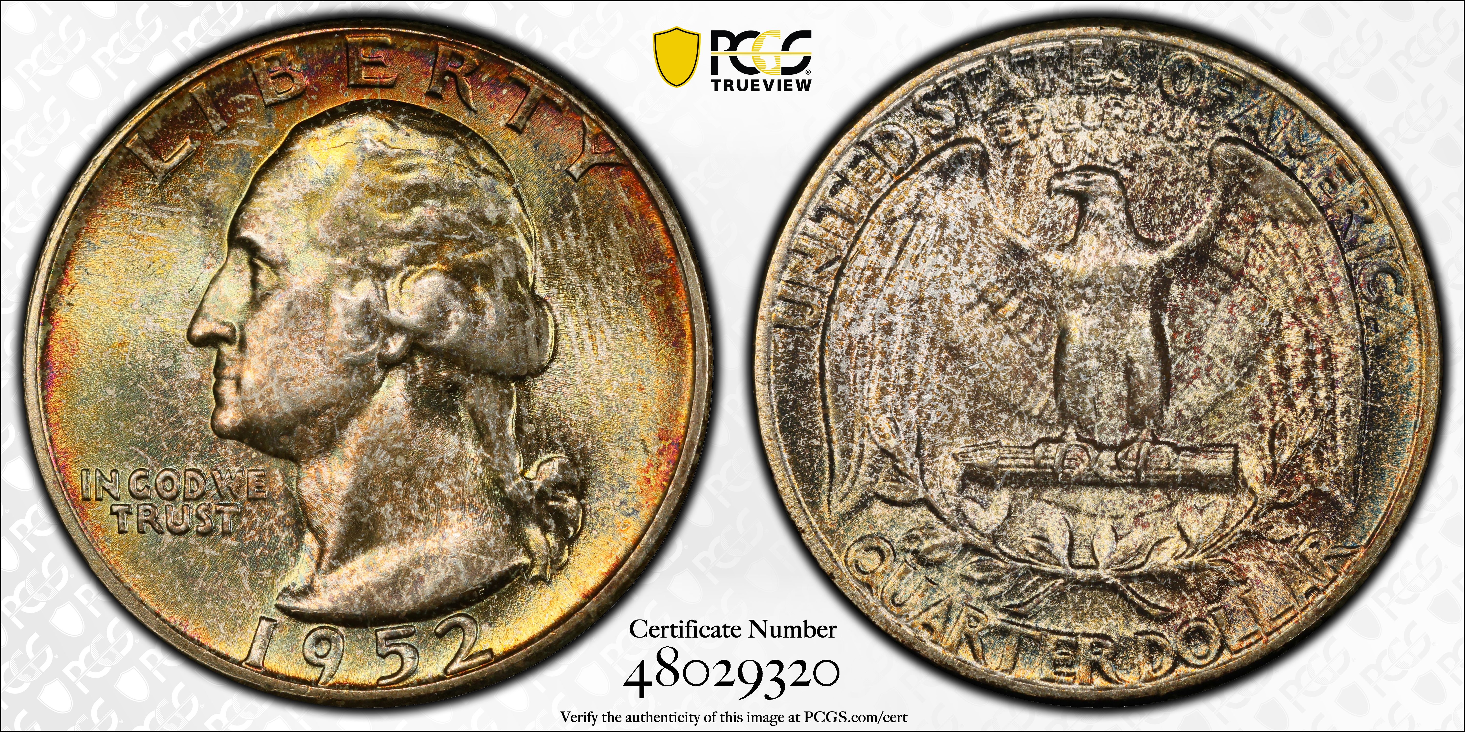 The 1952 is of average rarity in Gem condition for the silver (1932-1964) Washington quarter series. It's a little bit tougher in Superb Gem MS66 or better condition than many of the earlier issues.