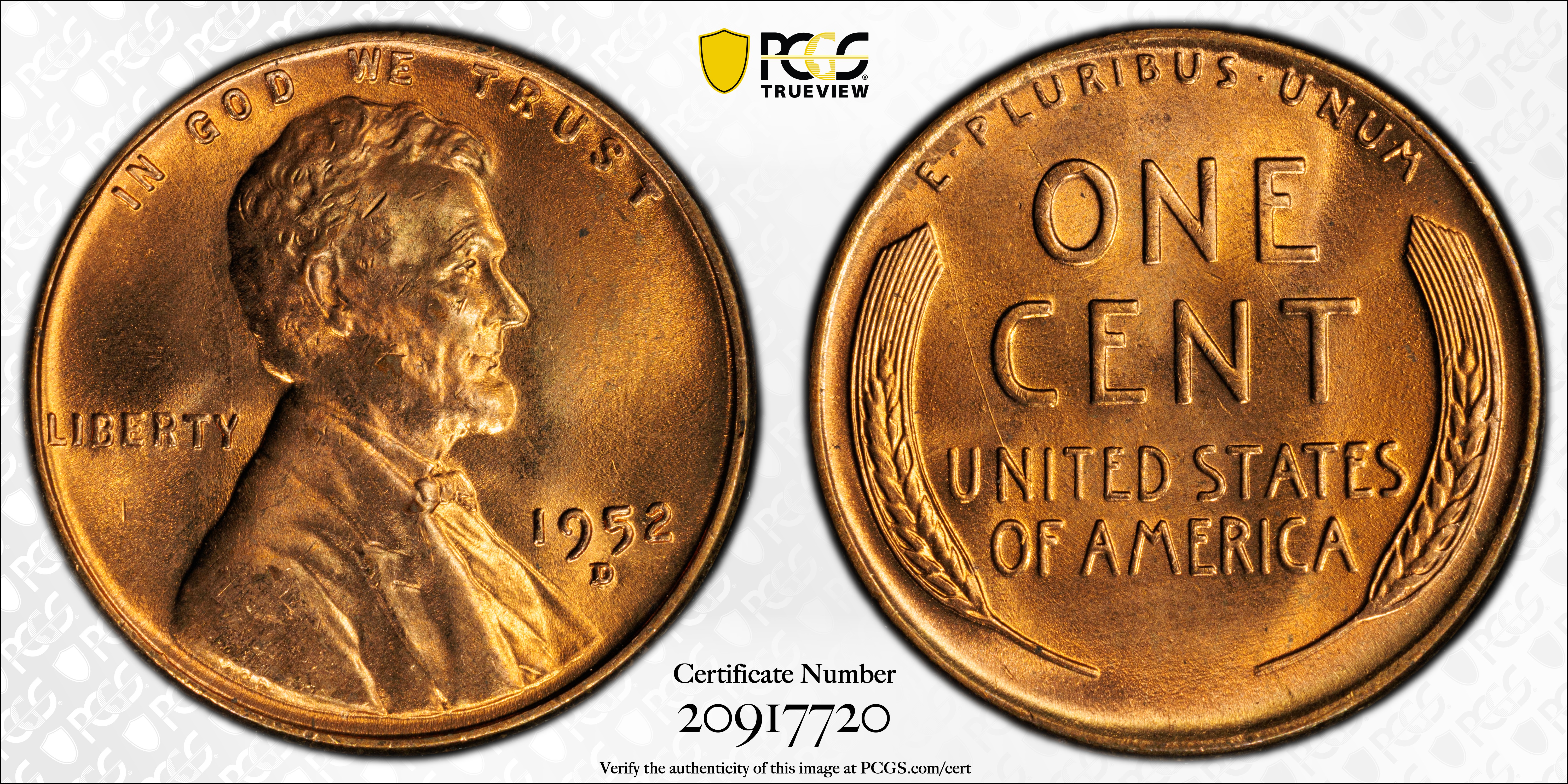 1952-D/S 1C OMM FS-511, RD MS66RD Certification #20917720, PCGS #37894