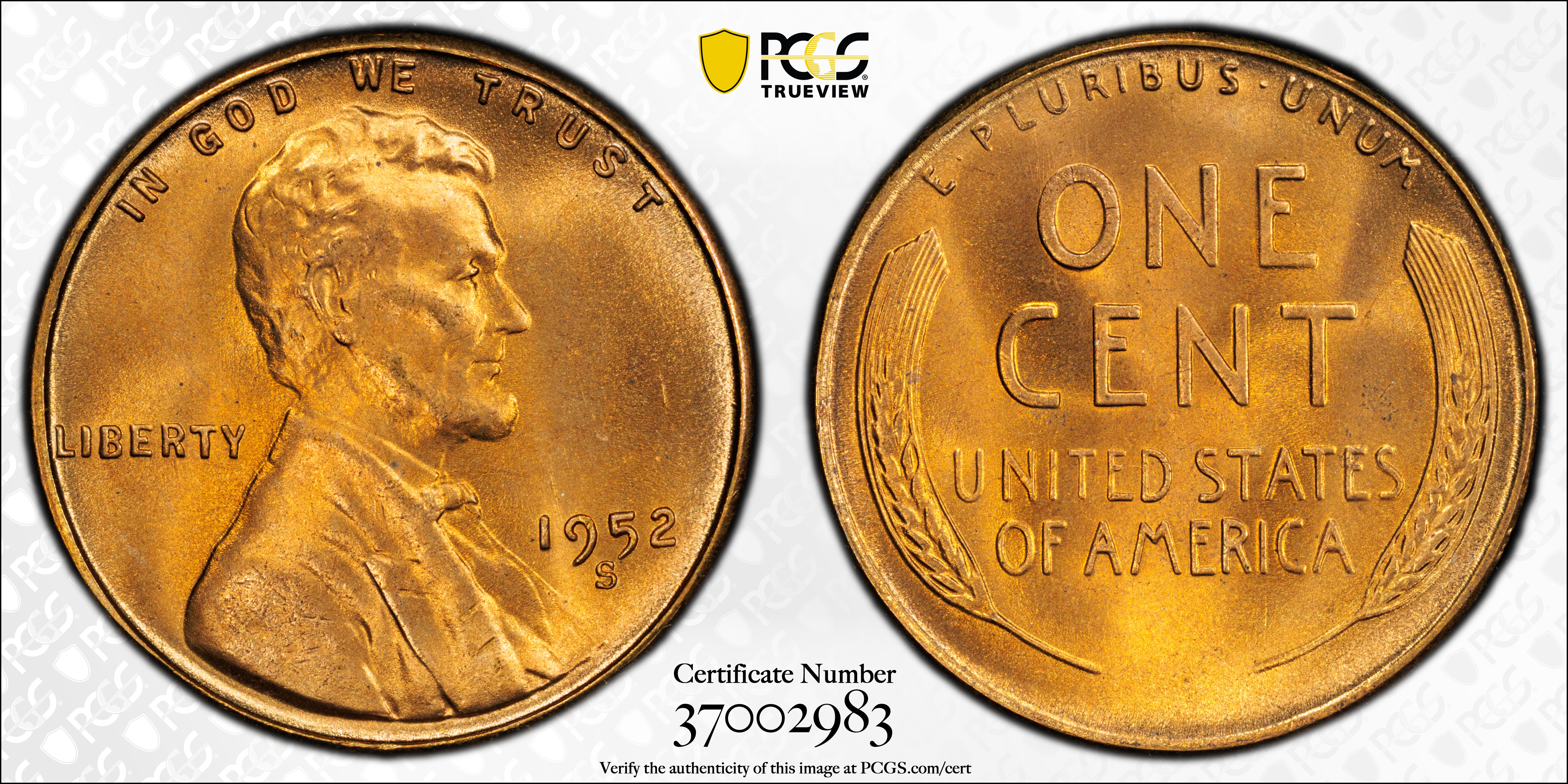 1952-S 1C, RD MS67+ RD Certification #37002983, PCGS #2803