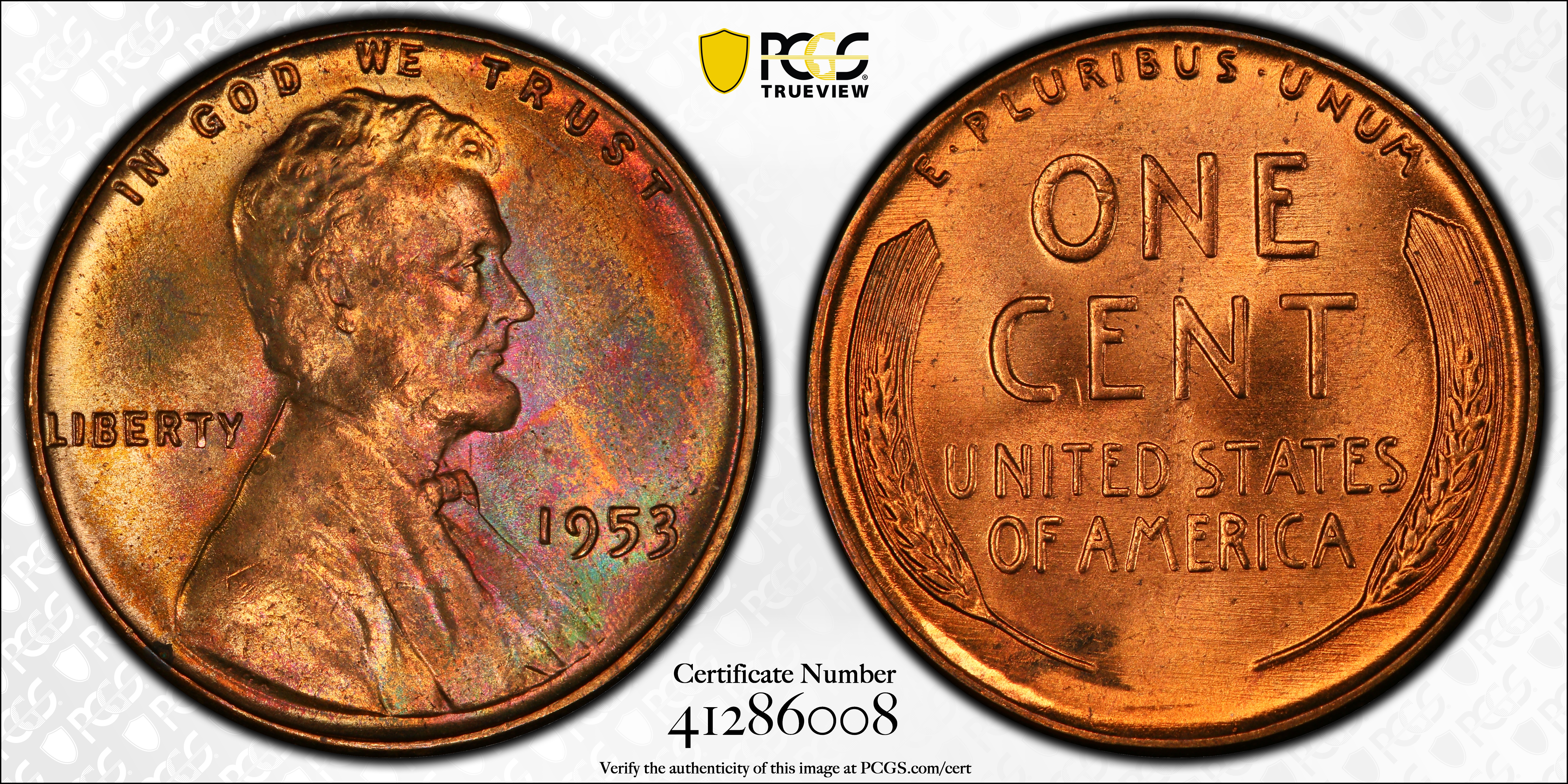 1953 1C, RB MS66RB Certification #41286008, PCGS #2805