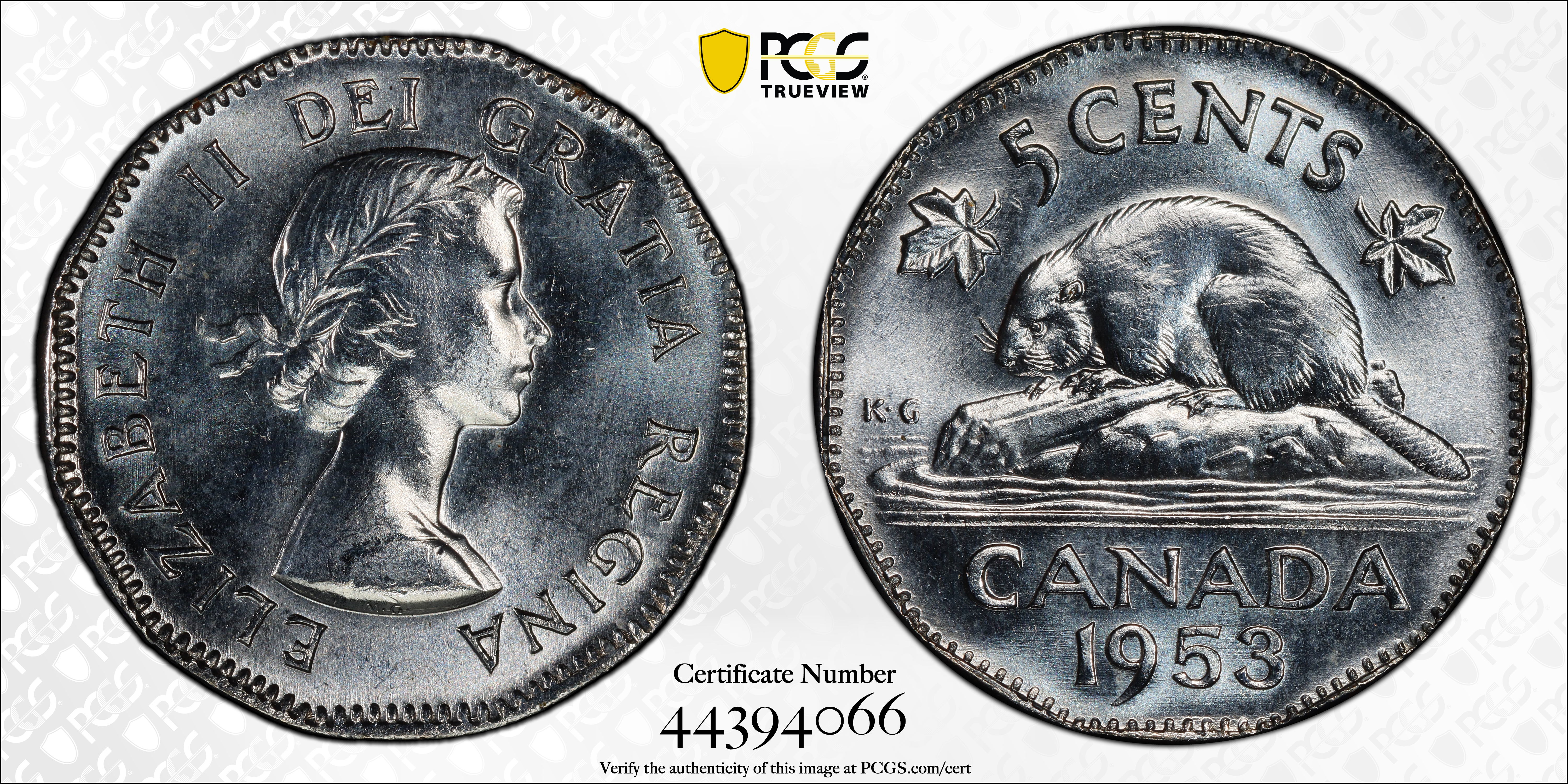 1953 5C No Strap, Far Leaf MS65 Certification #44394066, PCGS #31170