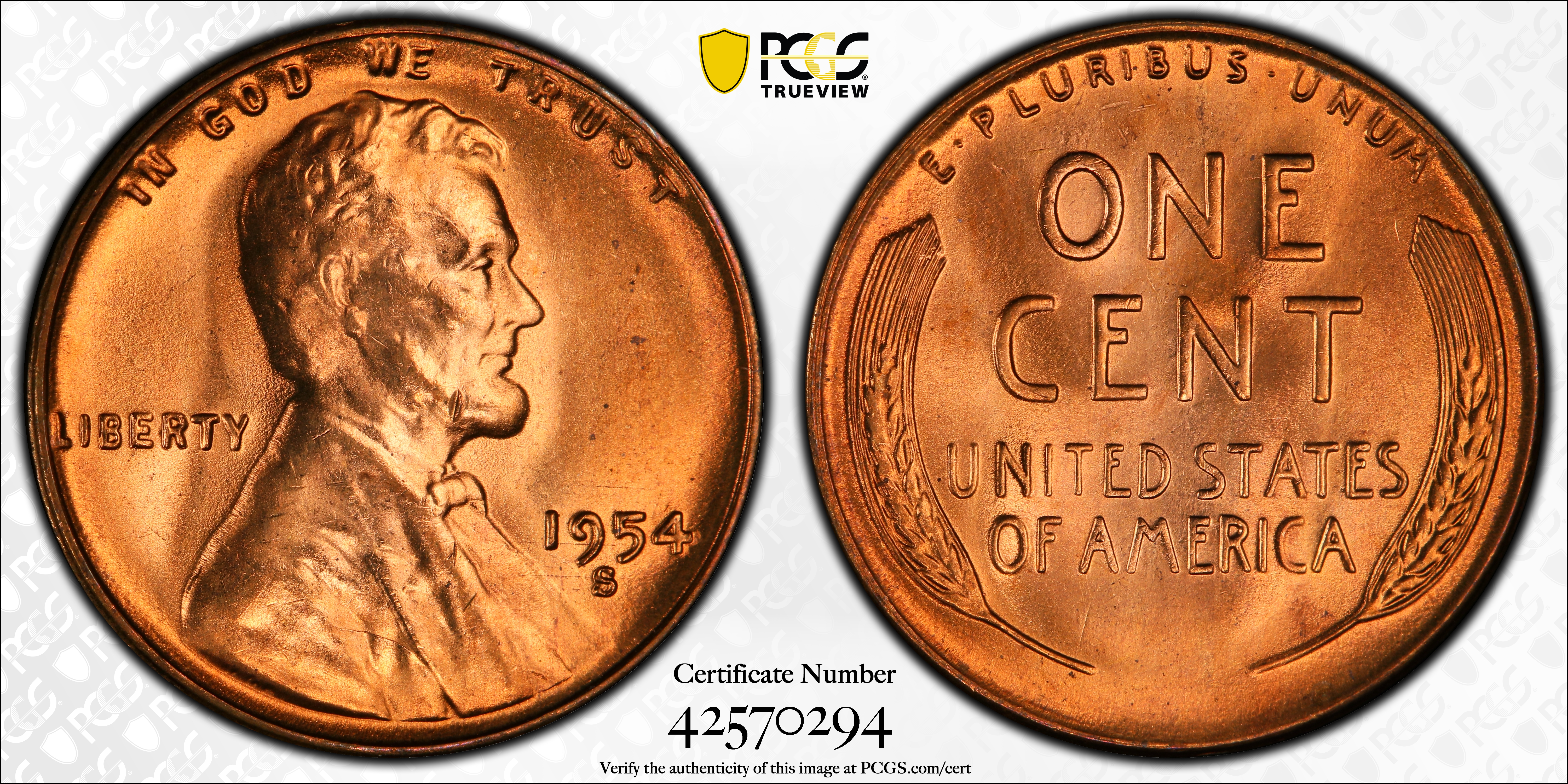 1954-S 1C, RD MS65RD Certification #42570294, PCGS #2821