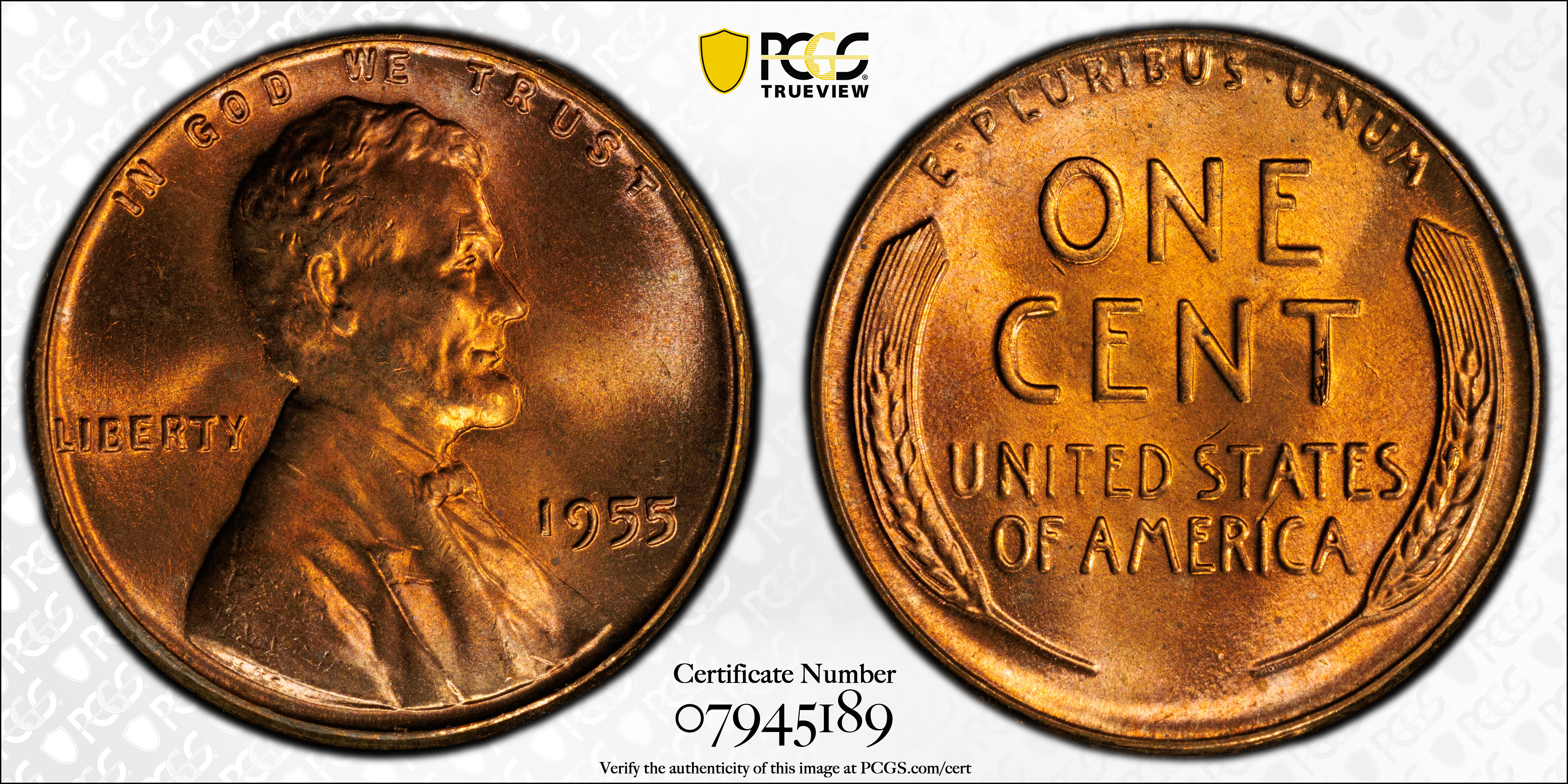 1955 1C, RD MS67RD Certification #07945189, PCGS #2824