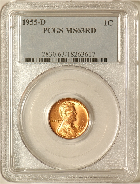 1955-D 1C, RD MS63RD Certification #18263617, PCGS #2830
