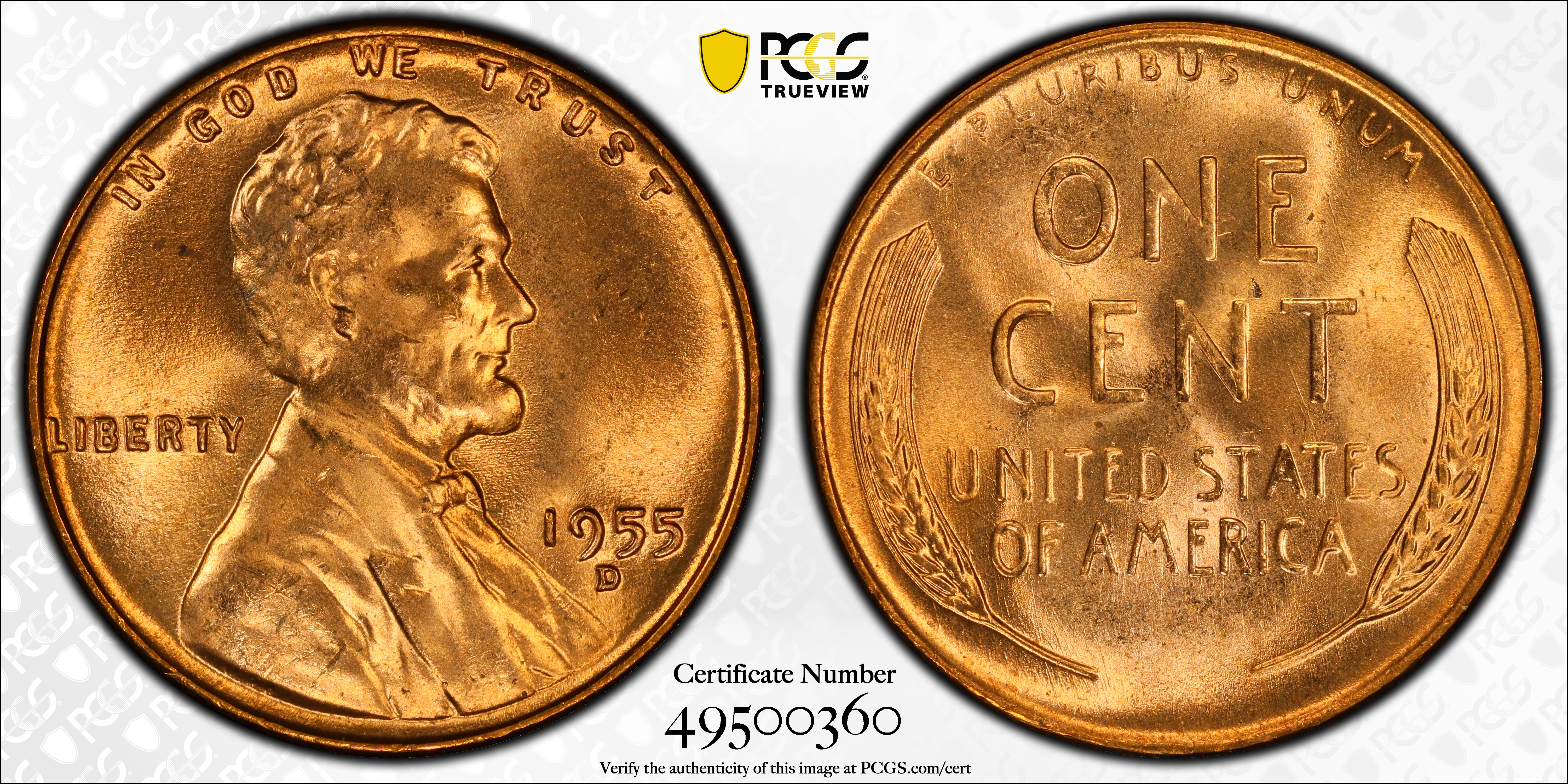 1955-D 1C, RD MS65RD Certification #49500360, PCGS #2830