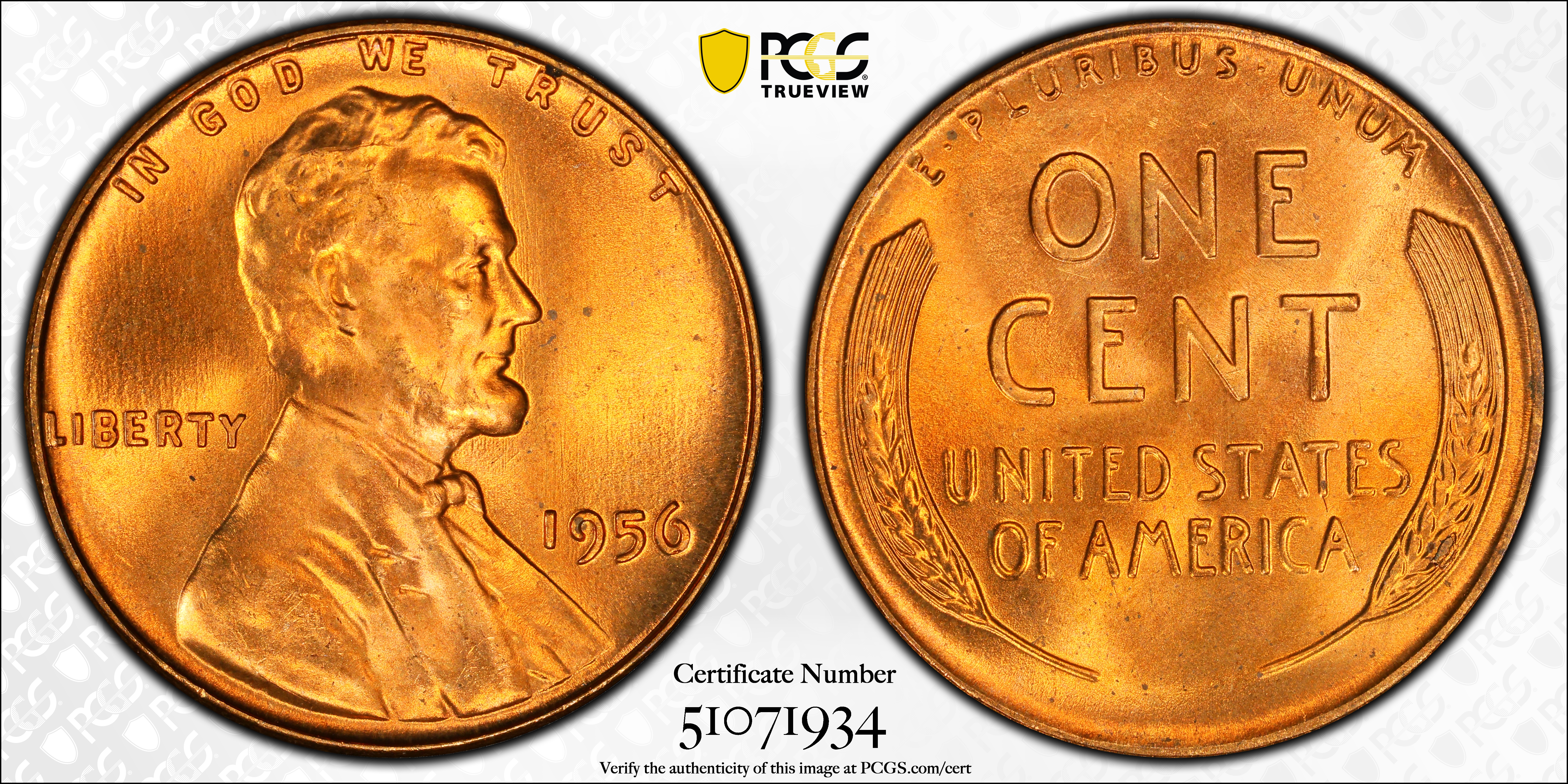 1956 1C, RD MS67RD Certification #51071934, PCGS #2836