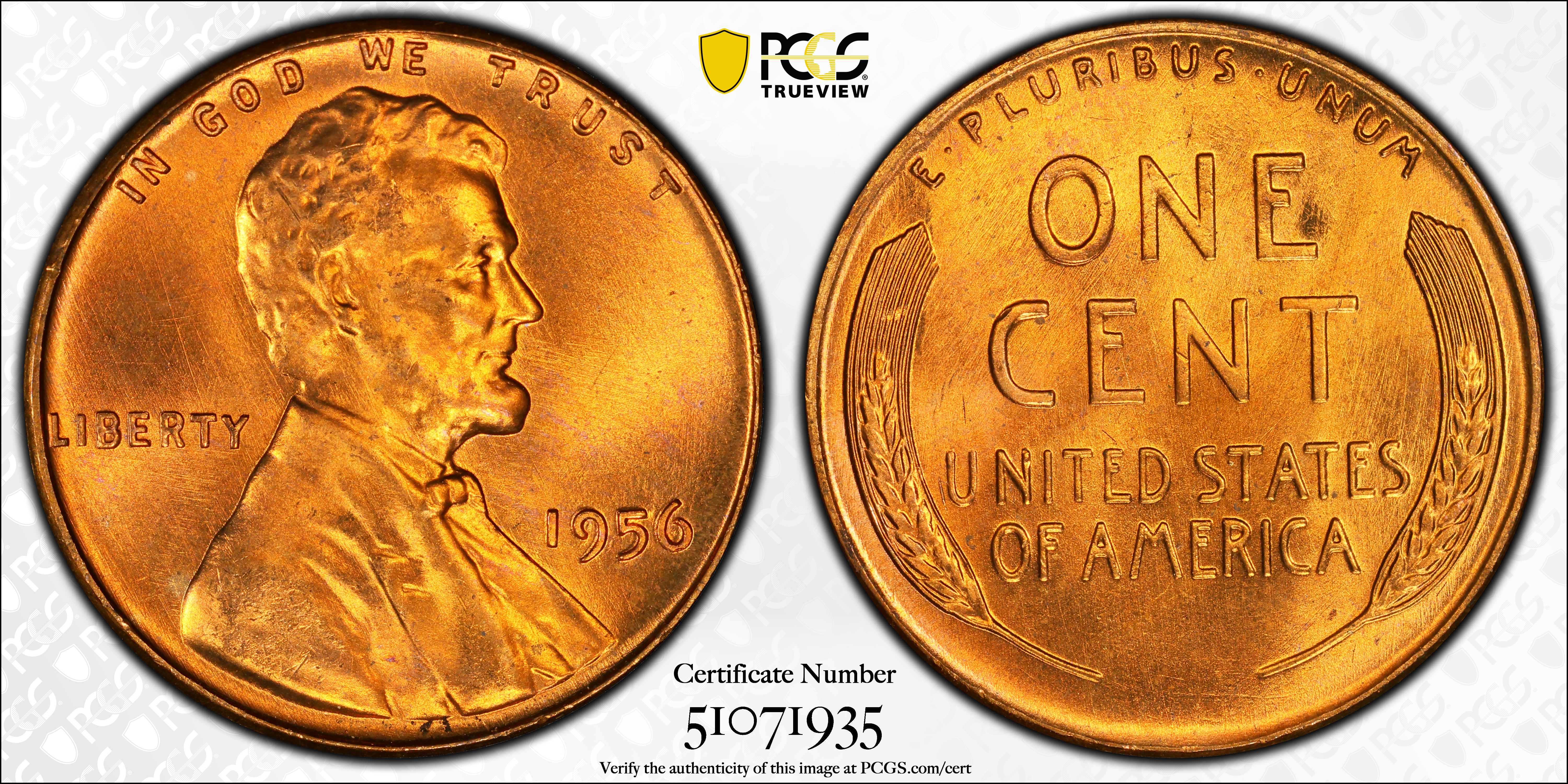1956 1C, RD MS67RD Certification #51071935, PCGS #2836