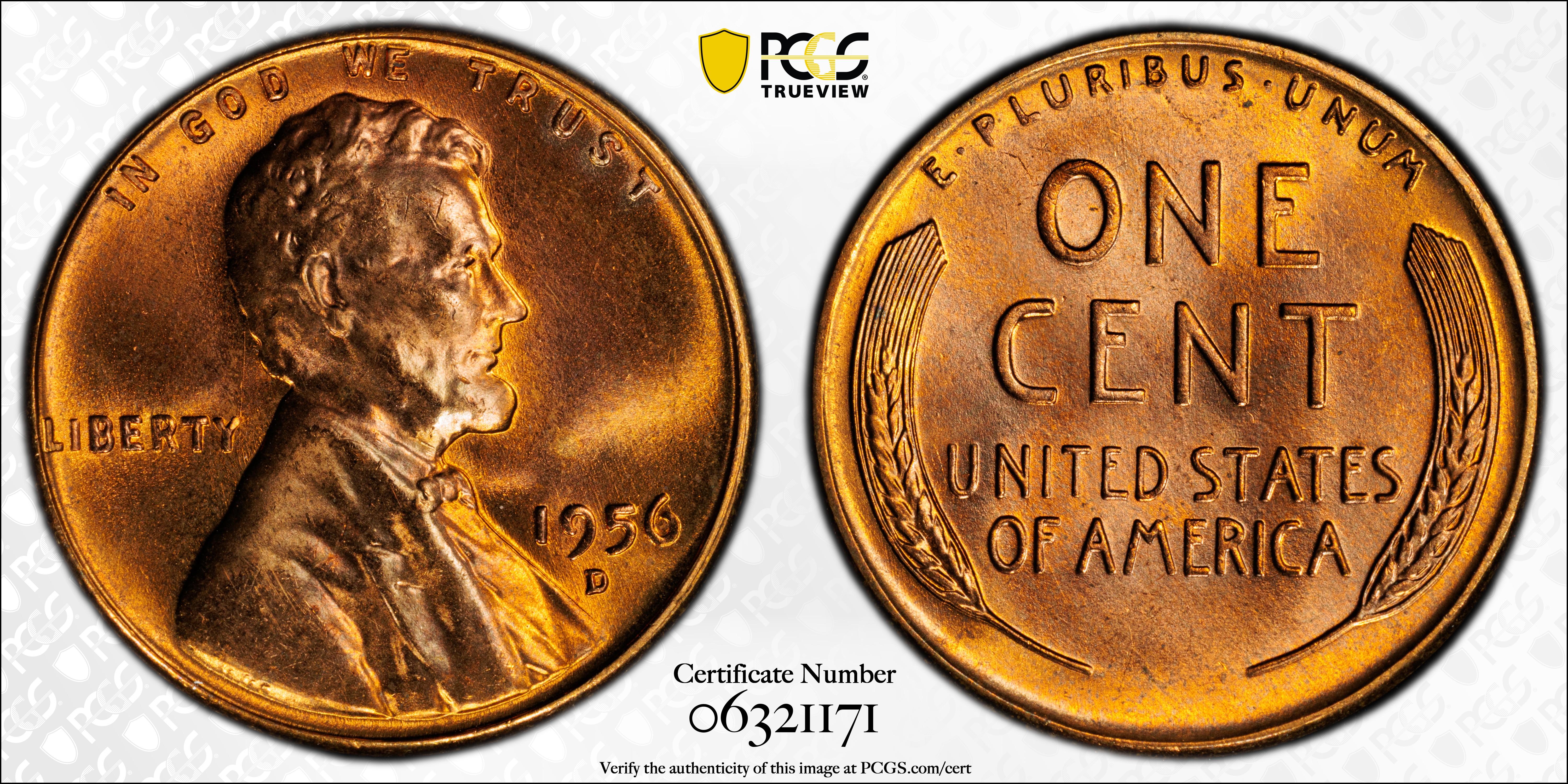 1956-D 1C, RD MS67RD Certification #06321171, PCGS #2839