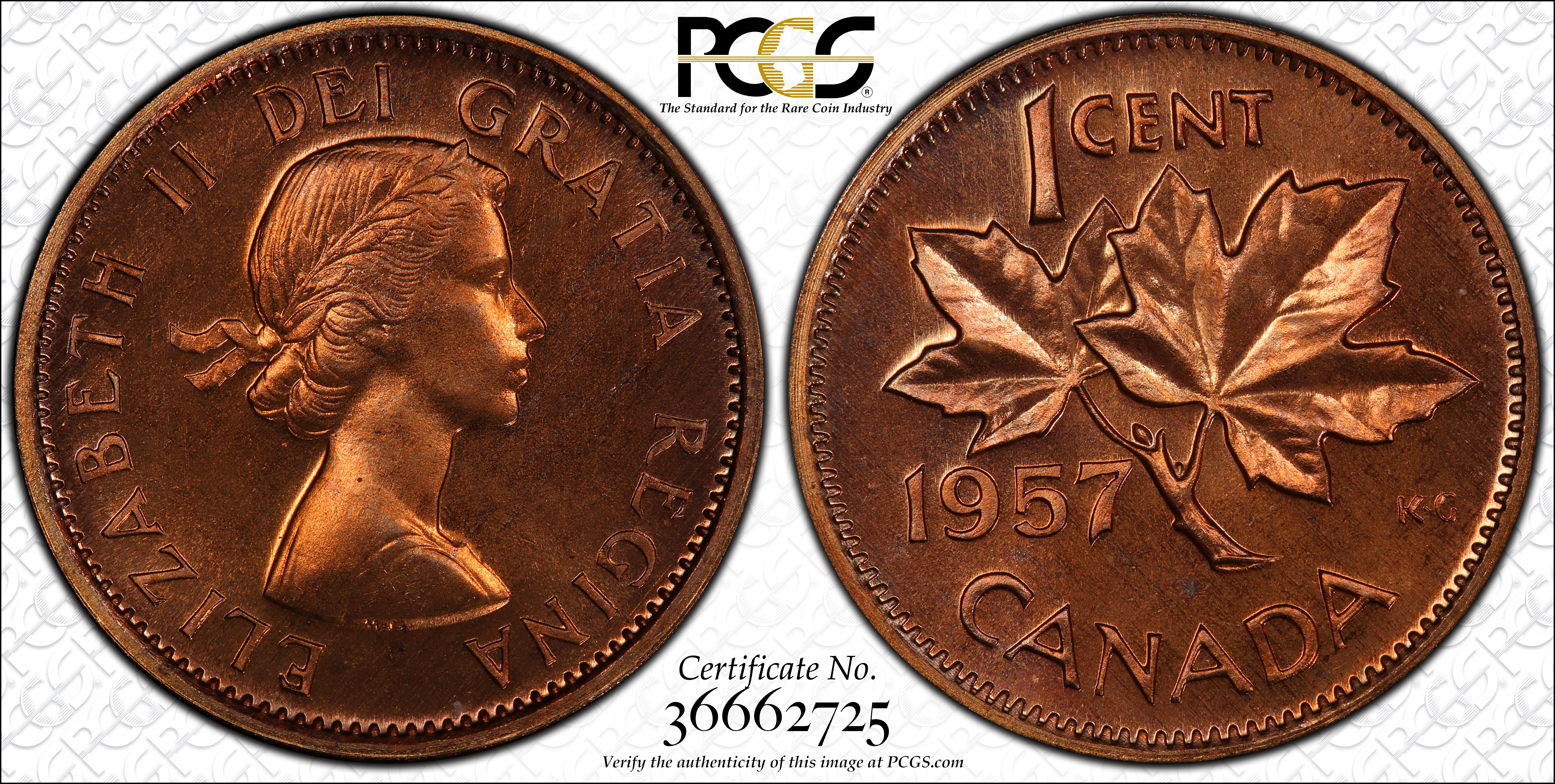1957 1C, RD PL66RD Certification #36662725, PCGS #30668