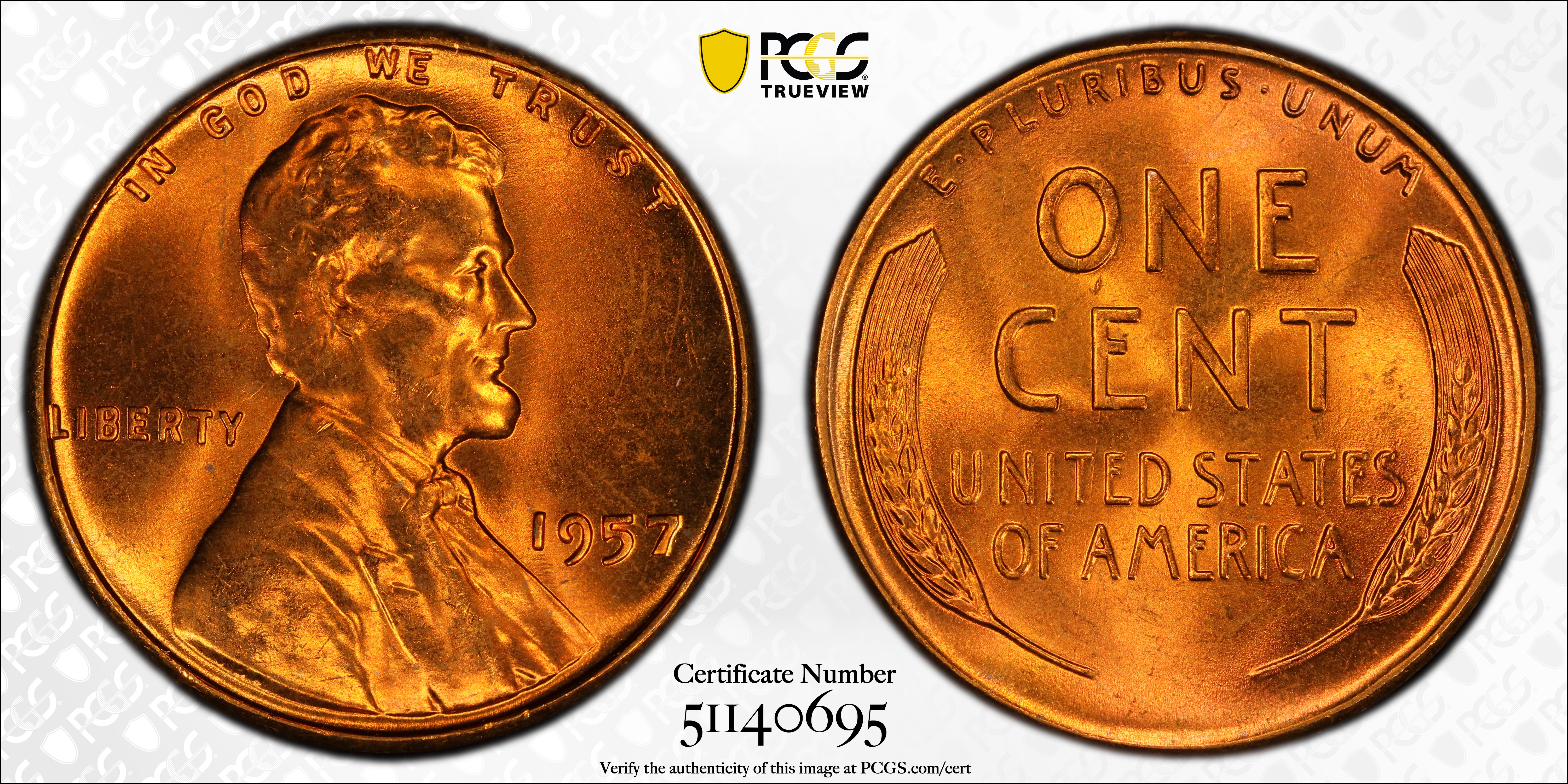 1957 1C, RD MS67RD Certification #51140695, PCGS #2842