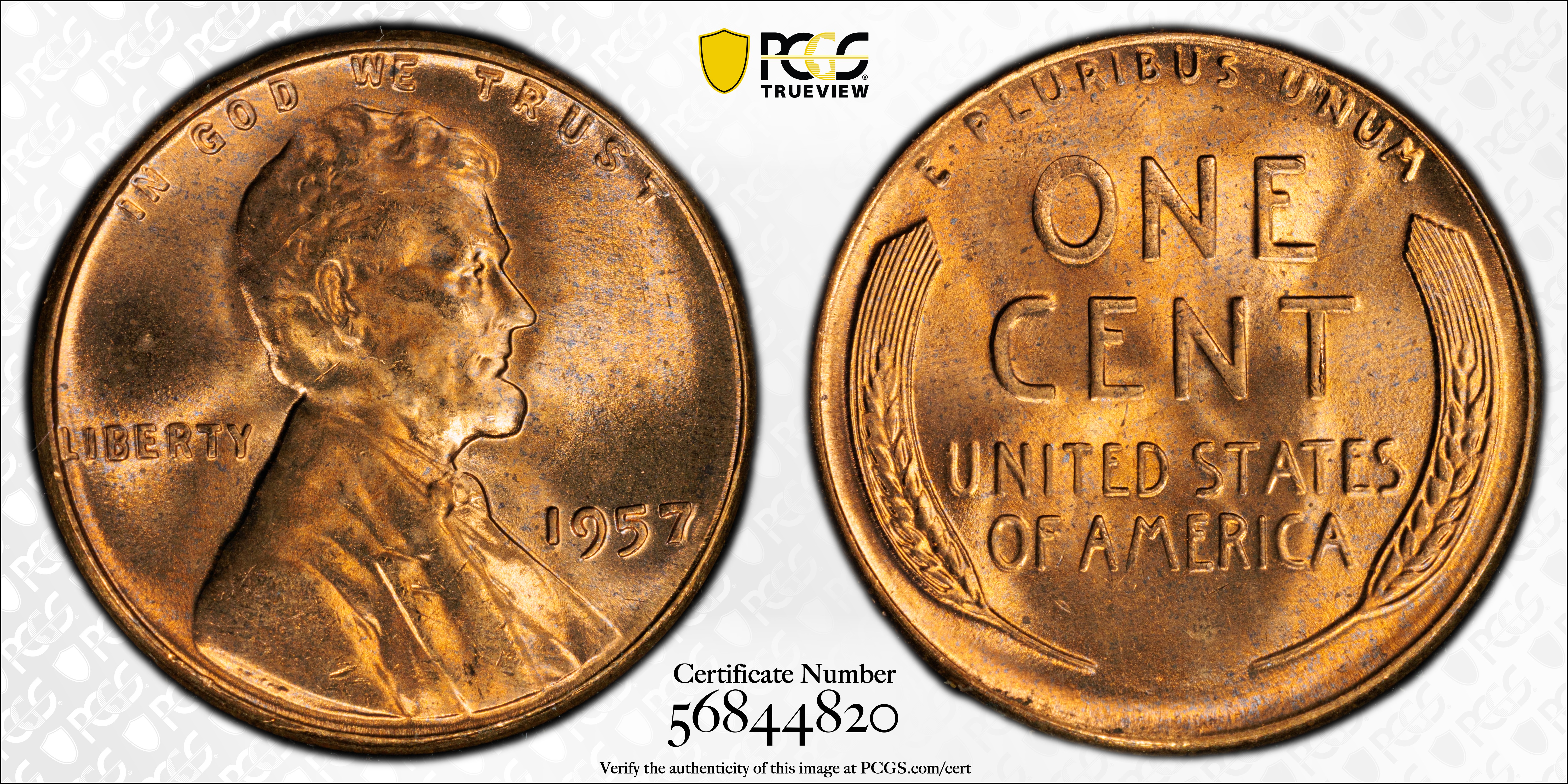 1957 1C, RD MS65RD Certification #56844820, PCGS #2842
