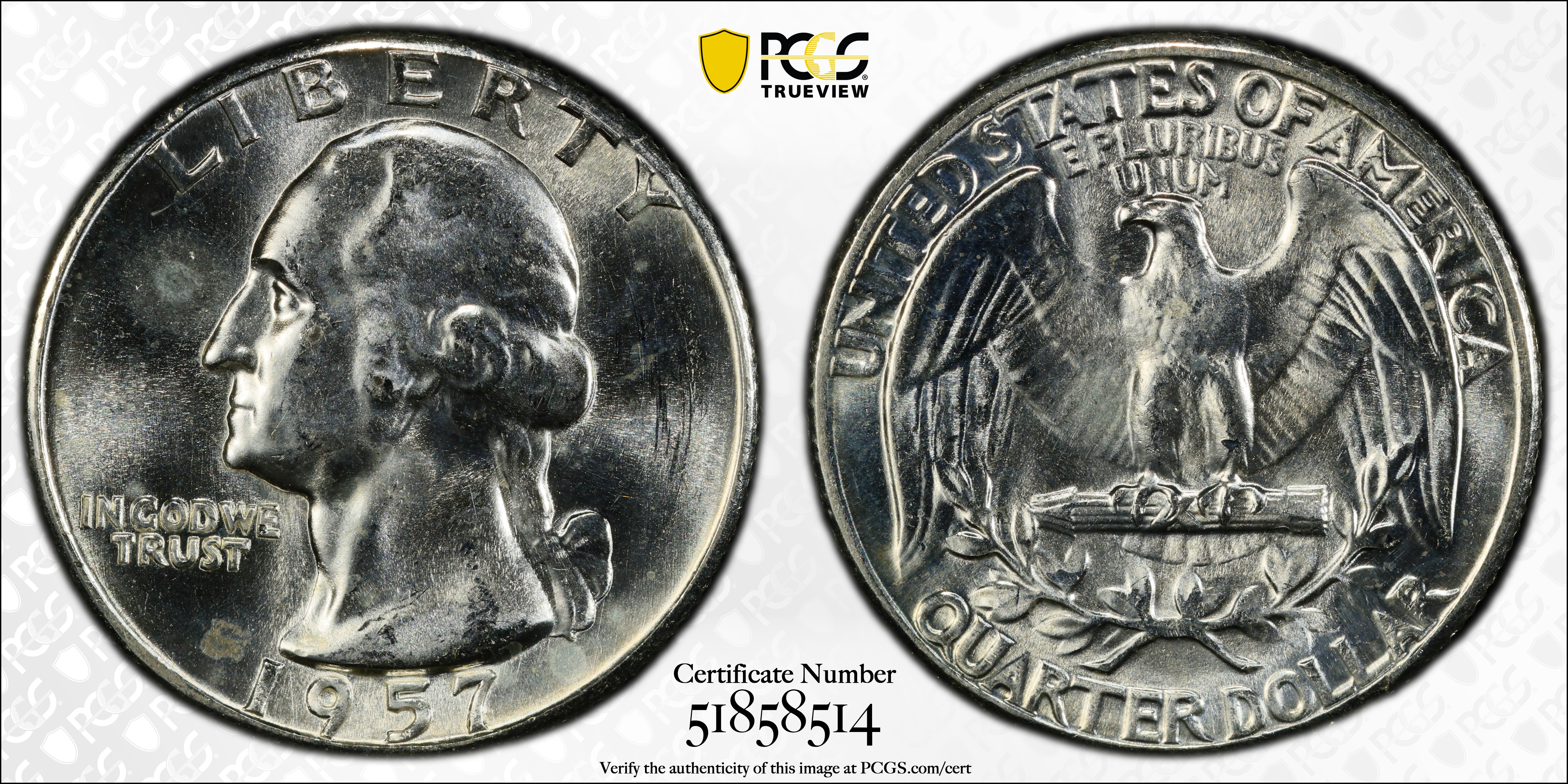 The 1957 is one of the more common silver Washington quarters in Gem condition. There are a large number of Superb MS66s known.