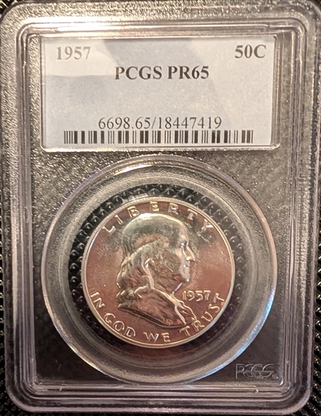 The 1957 Proof Franklin Half Dollar is fairly common for a proof coin. In PR60 to about PR67 it is easy and inexpensive to obtain. In PR68 it becomes much scarcer and worth a significantly higher premium than PR67 examples. When displaying Cameo surfaces it is obviously scarcer than non Cameo examples. With enough searching a Cameo example can be purchased inexpensively up to about PR67 grade. Examples displaying Deep Cameo surfaces are very scarce with less than a few hundred examples known in all grades combined.