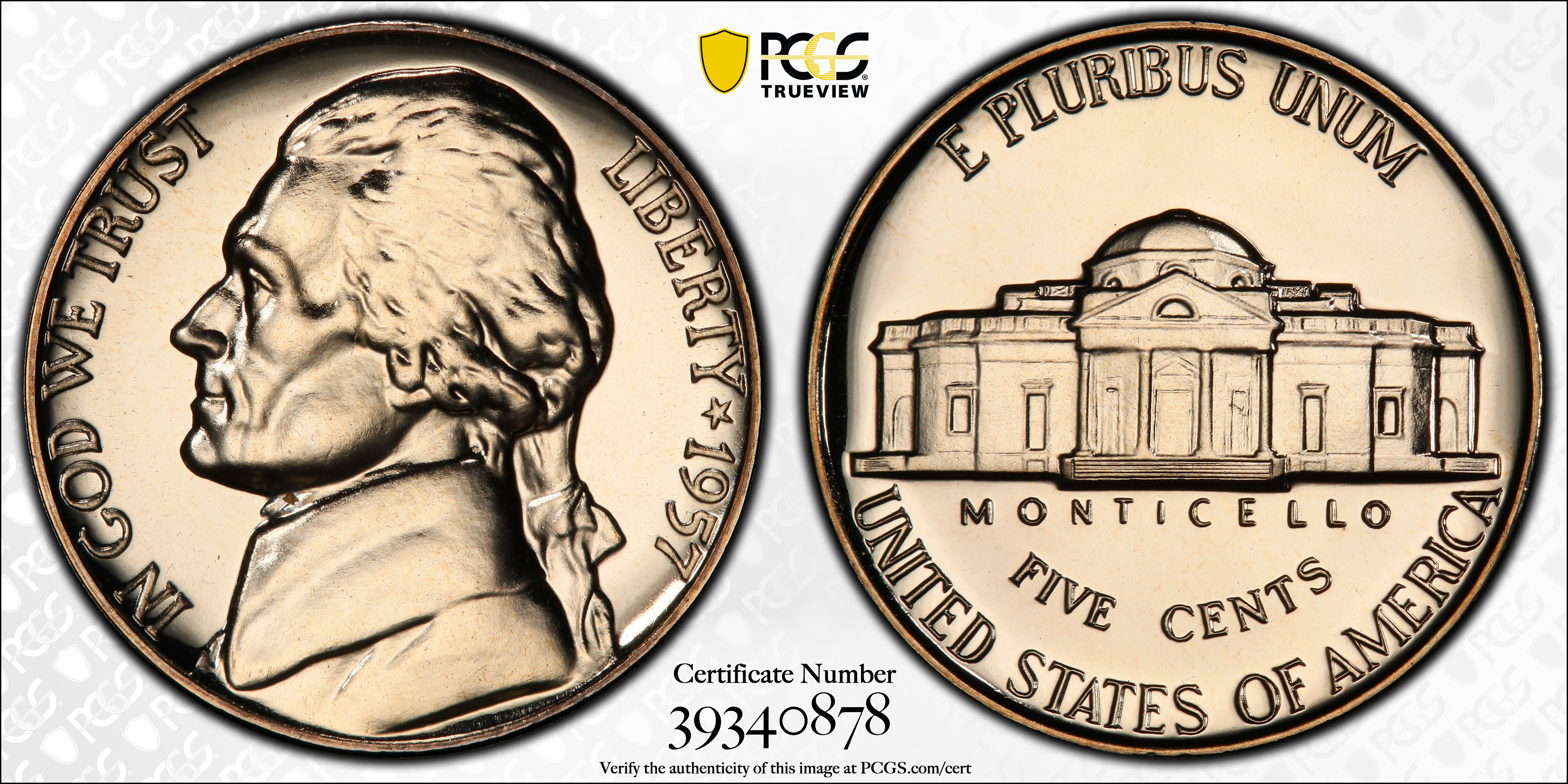 The 1957 Proof Jefferson Nickel can be obtained up to about PR67 grades with minimal efforts. In PR68 condition it is much scarcer and tougher to find. Anything grading higher than PR69 is almost unheard of. Overall, it should be fairly easy to find a nice example of this issue.