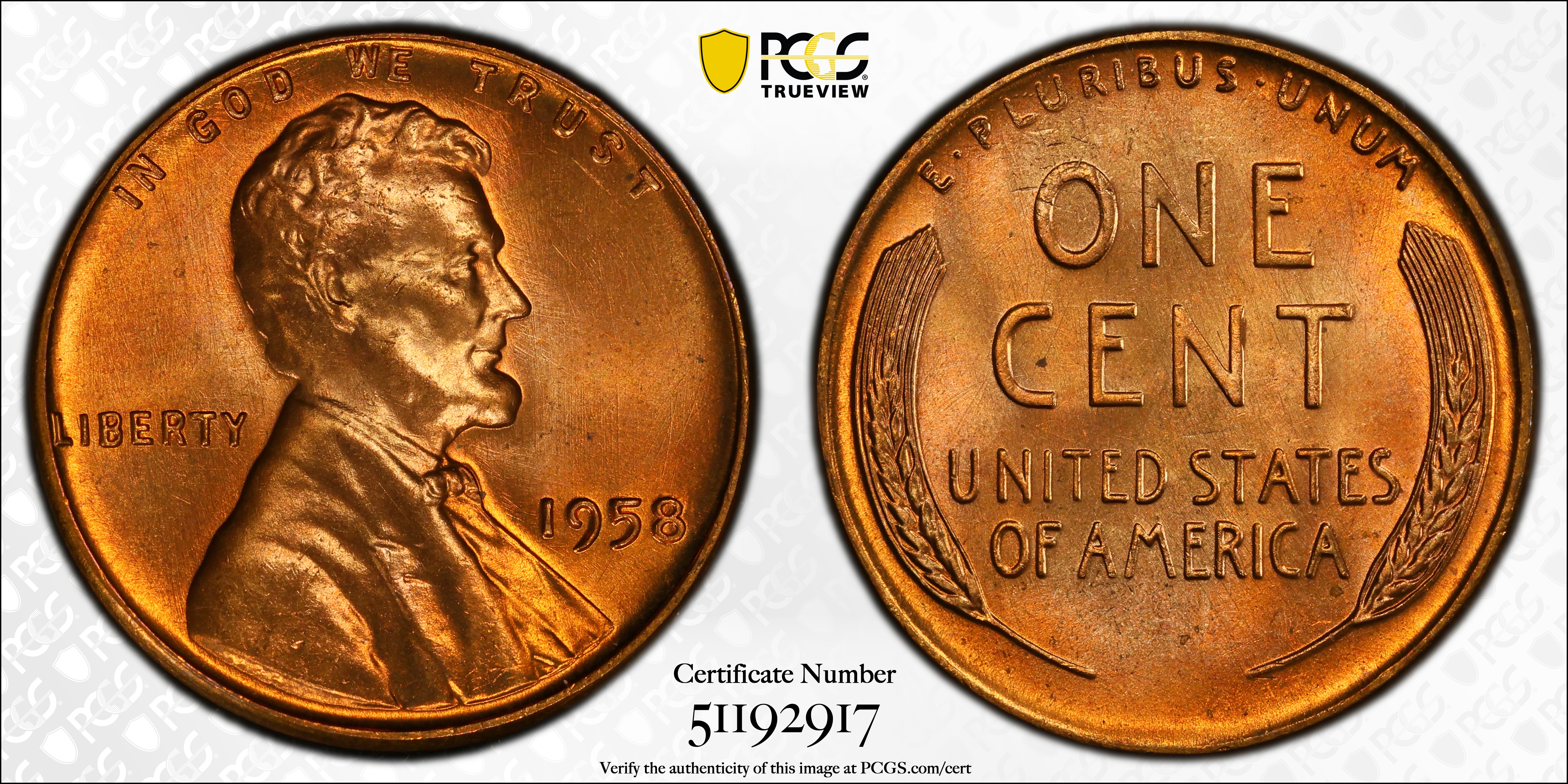 1958 1C, RD MS67RD Certification #51192917, PCGS #2848