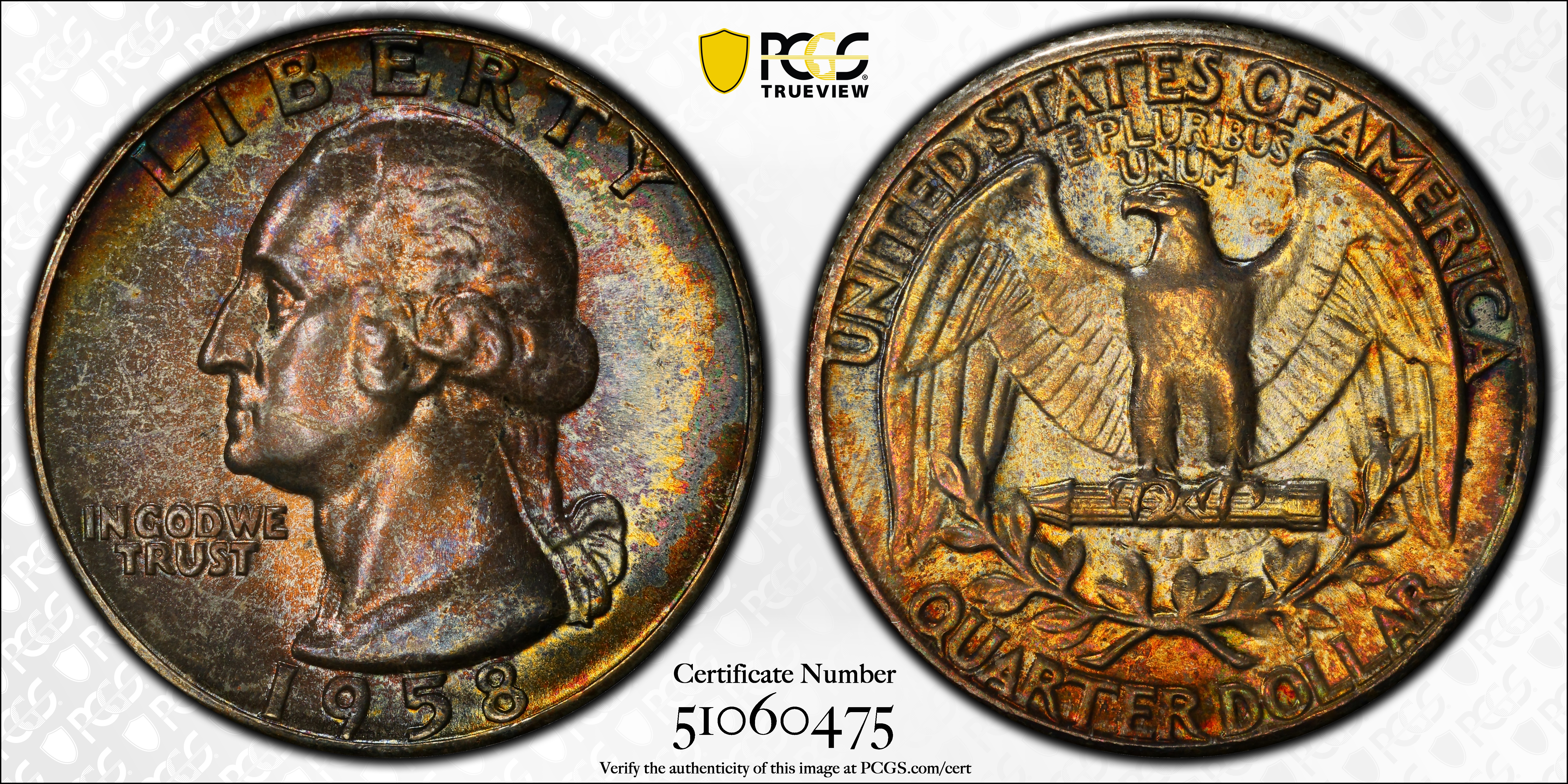 The 1958 is the fourth lowest mintage 1941-1964 Washington quarter, yet it one of the most common in Gem condition. The low mintage caused a large number of original rolls to be saved by collectors and speculators in the year of issue. Today, all those saved rolls are the source of the many frosty white Gems that survive. There are also a number of beautifully toned Gems from original Government mint sets.