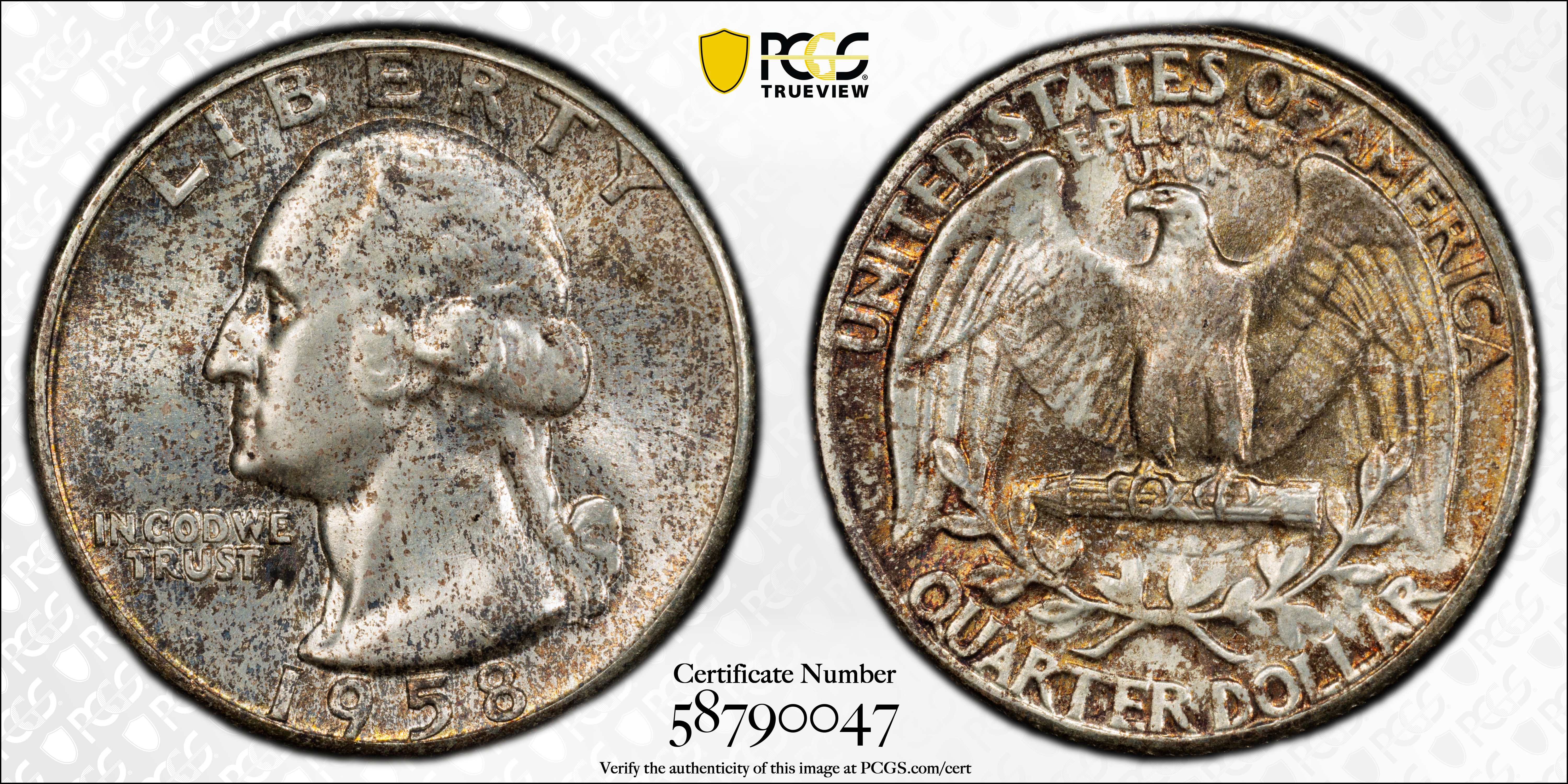 The 1958 is the fourth lowest mintage 1941-1964 Washington quarter, yet it one of the most common in Gem condition. The low mintage caused a large number of original rolls to be saved by collectors and speculators in the year of issue. Today, all those saved rolls are the source of the many frosty white Gems that survive. There are also a number of beautifully toned Gems from original Government mint sets.