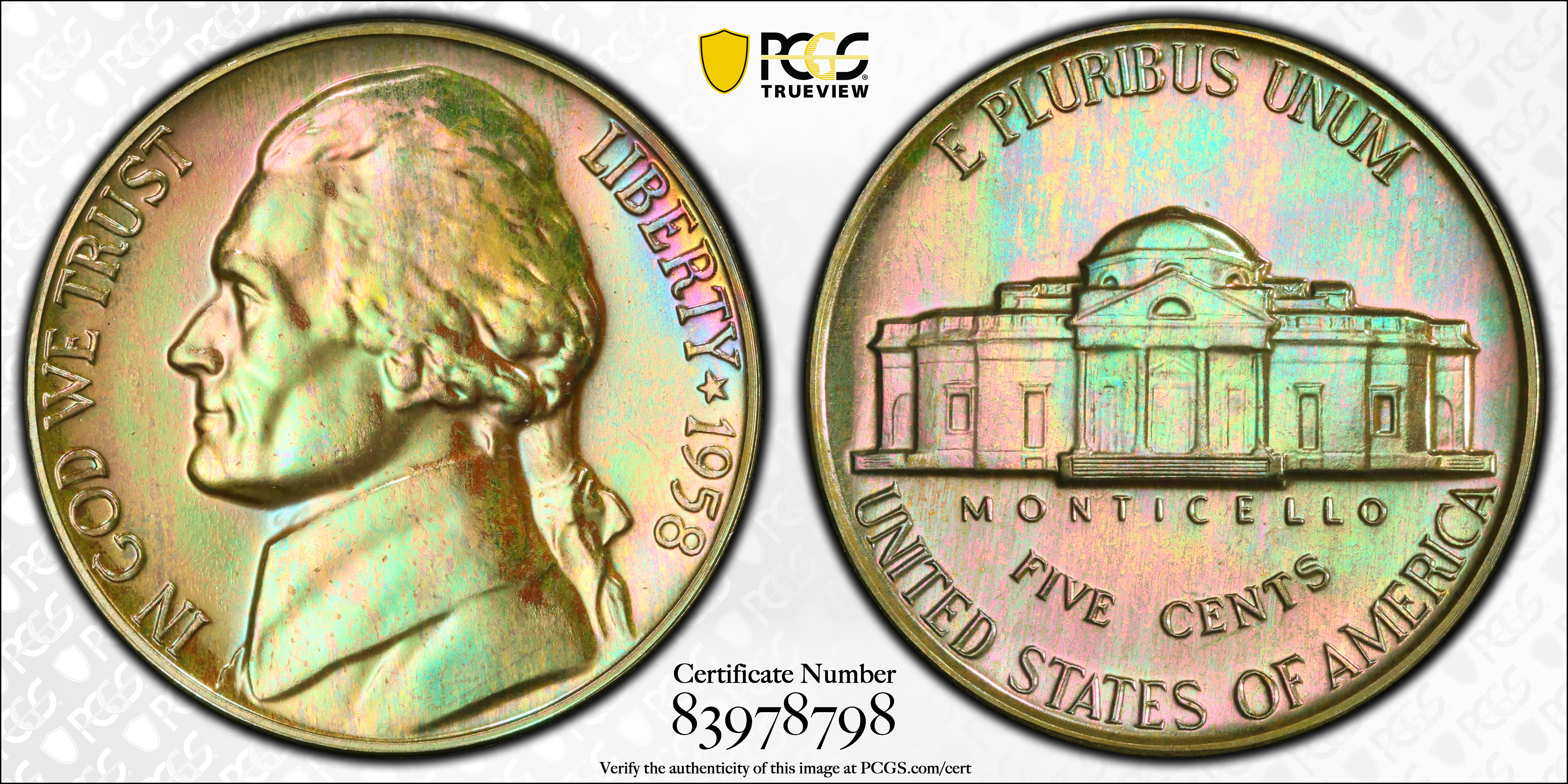 Most coins in the set were well struck, including the 1958 Proof Jefferson Nickel. Only in PR69 condition is it scarce. It is also scarce in PR68 condition with Cameo surfaces. And it is very scarce with Deep Cameo surfaces in any condition.