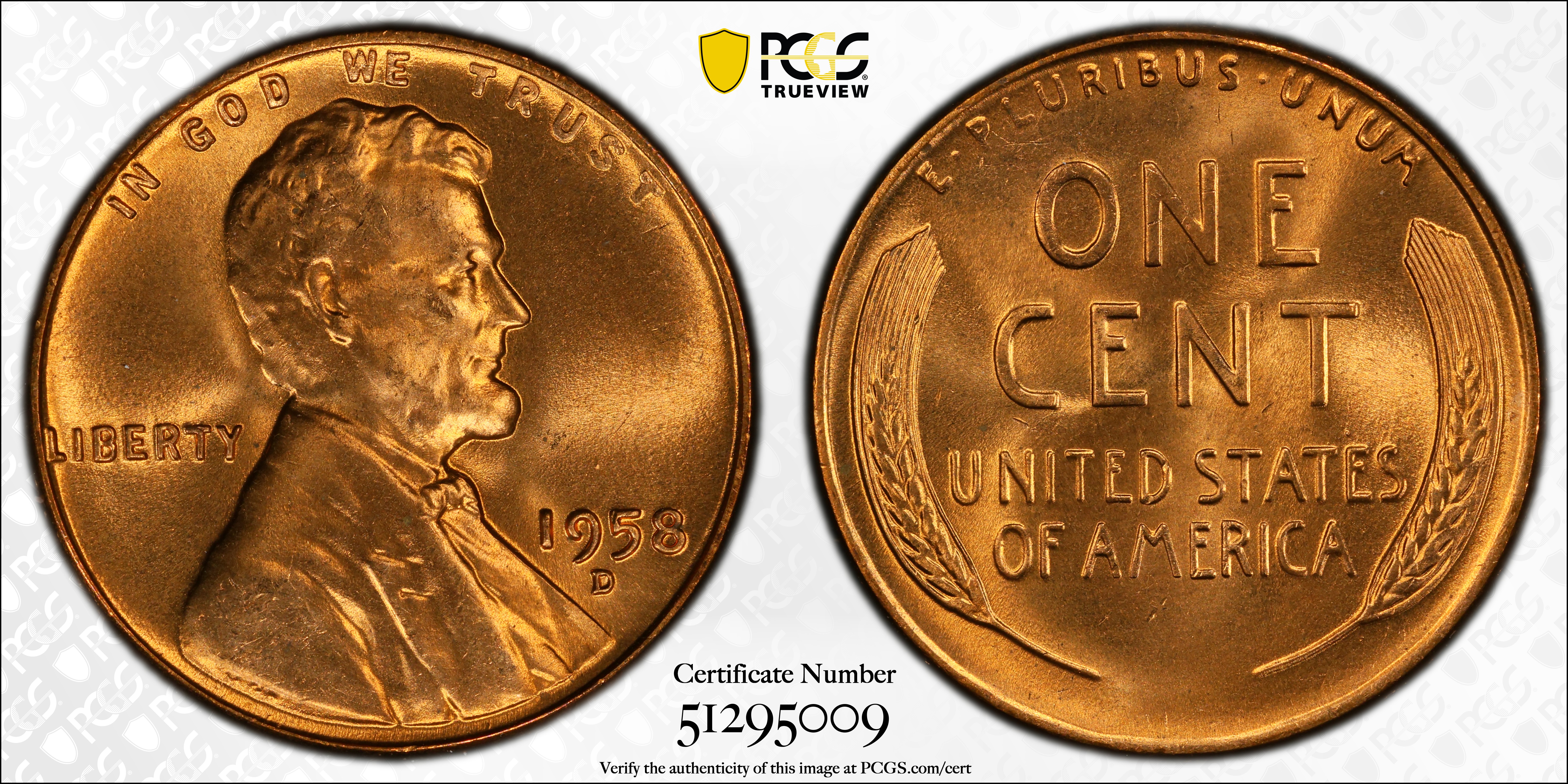 1958-D 1C, RD MS66RD Certification #51295009, PCGS #2851