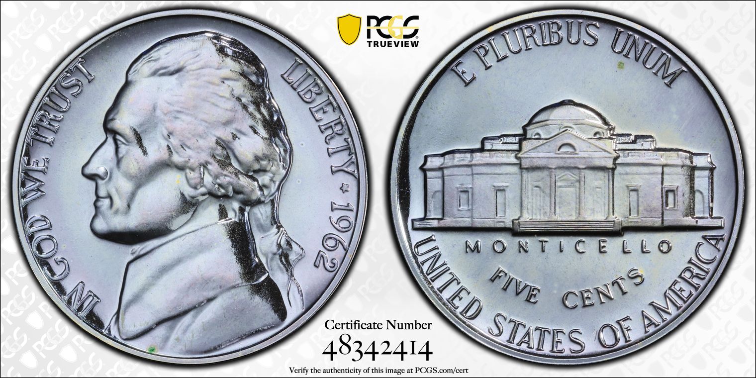 The U.S. Mint produced more than enough1962 Proof Jefferson Nickels to meet the collectors demand. Therefore, most examples can easily be obtained at minimal cost. Examples displaying cameo contrast command a slightly higher premium. Similarly, examples displaying deep cameo contrast also command a slight premium from cameo examples.