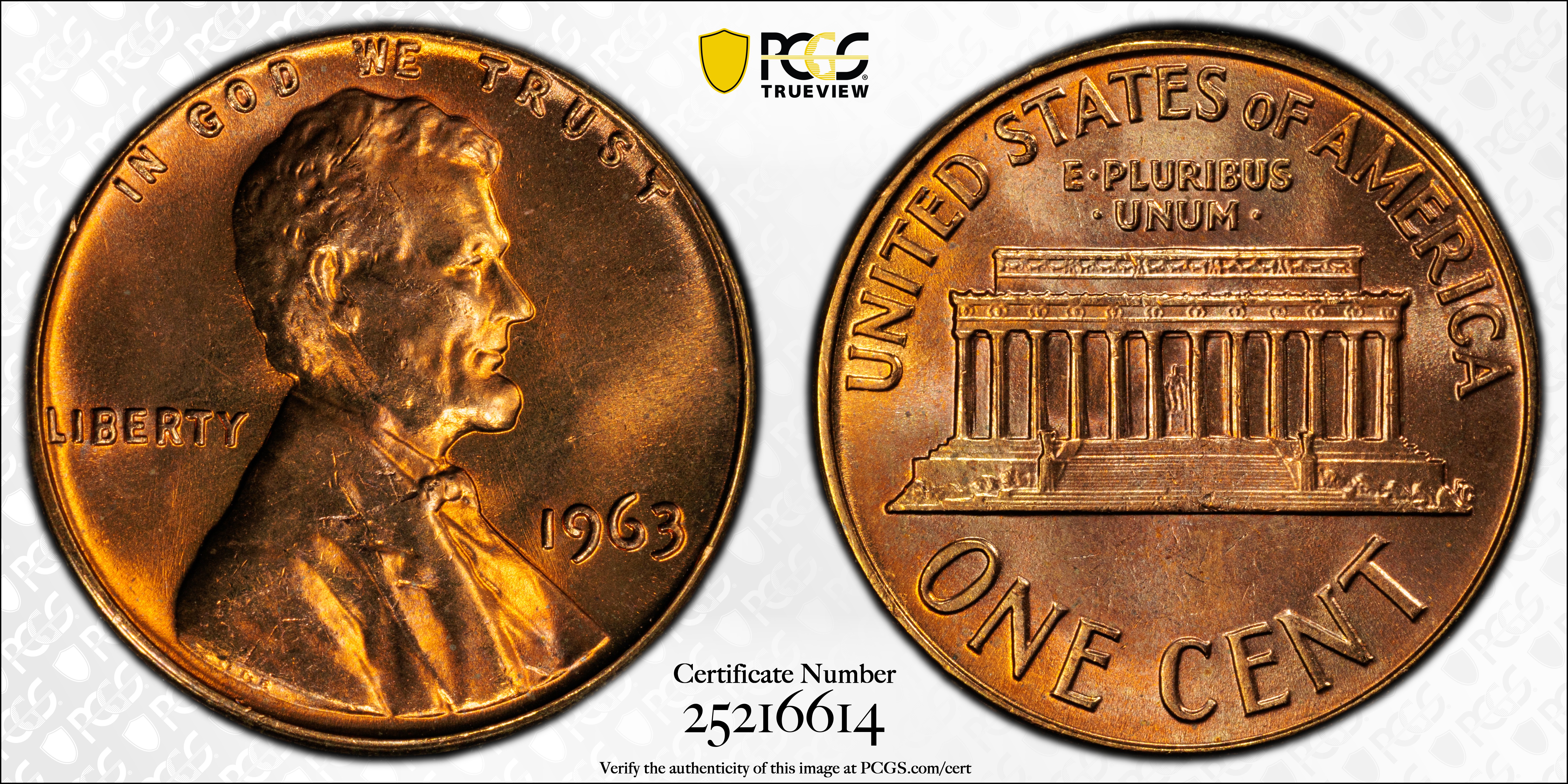 1963 1C, RD MS67RD Certification #25216614, PCGS #2884