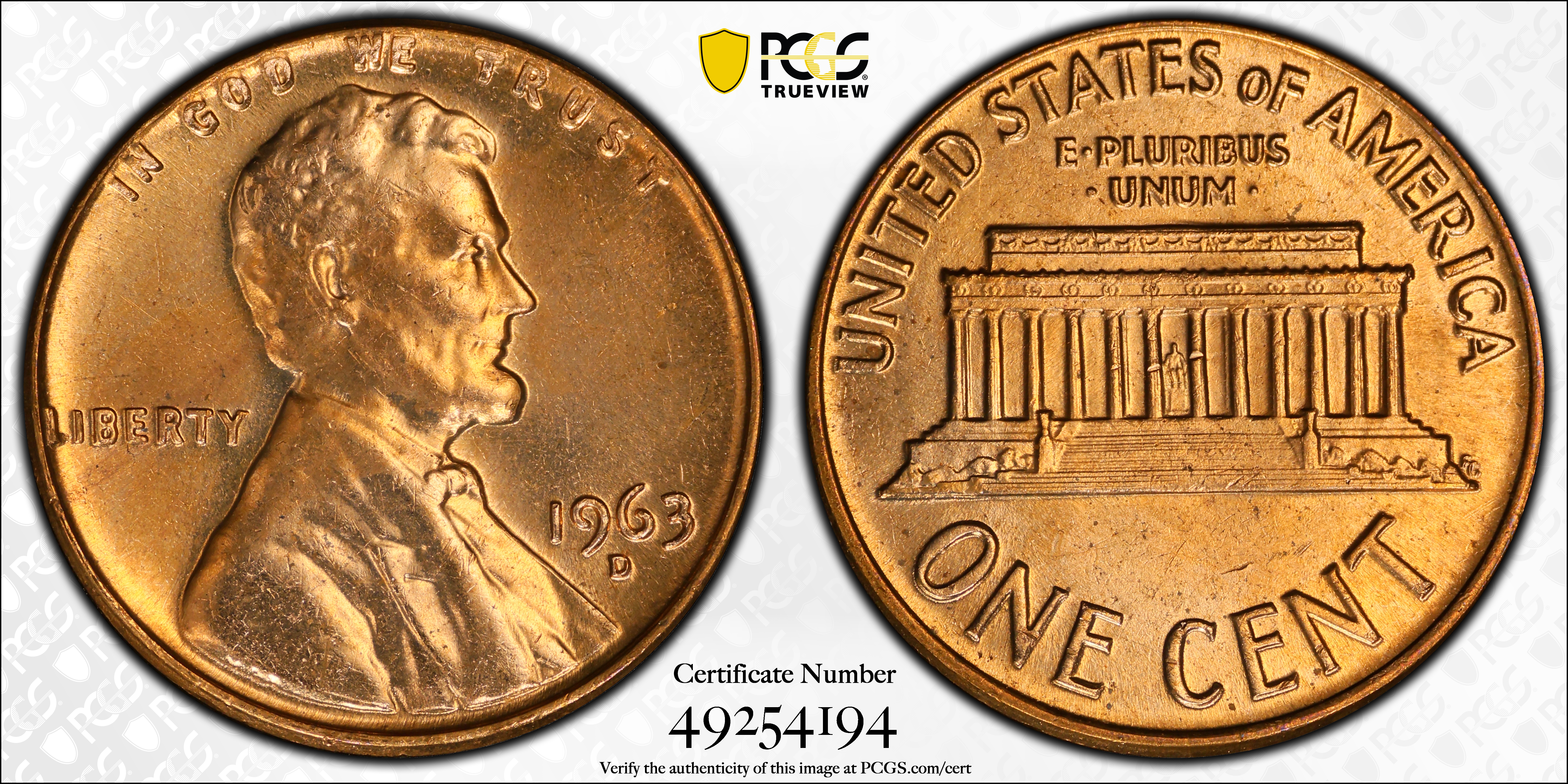 1963-D 1C, RD MS64RD Certification #49254194, PCGS #2887