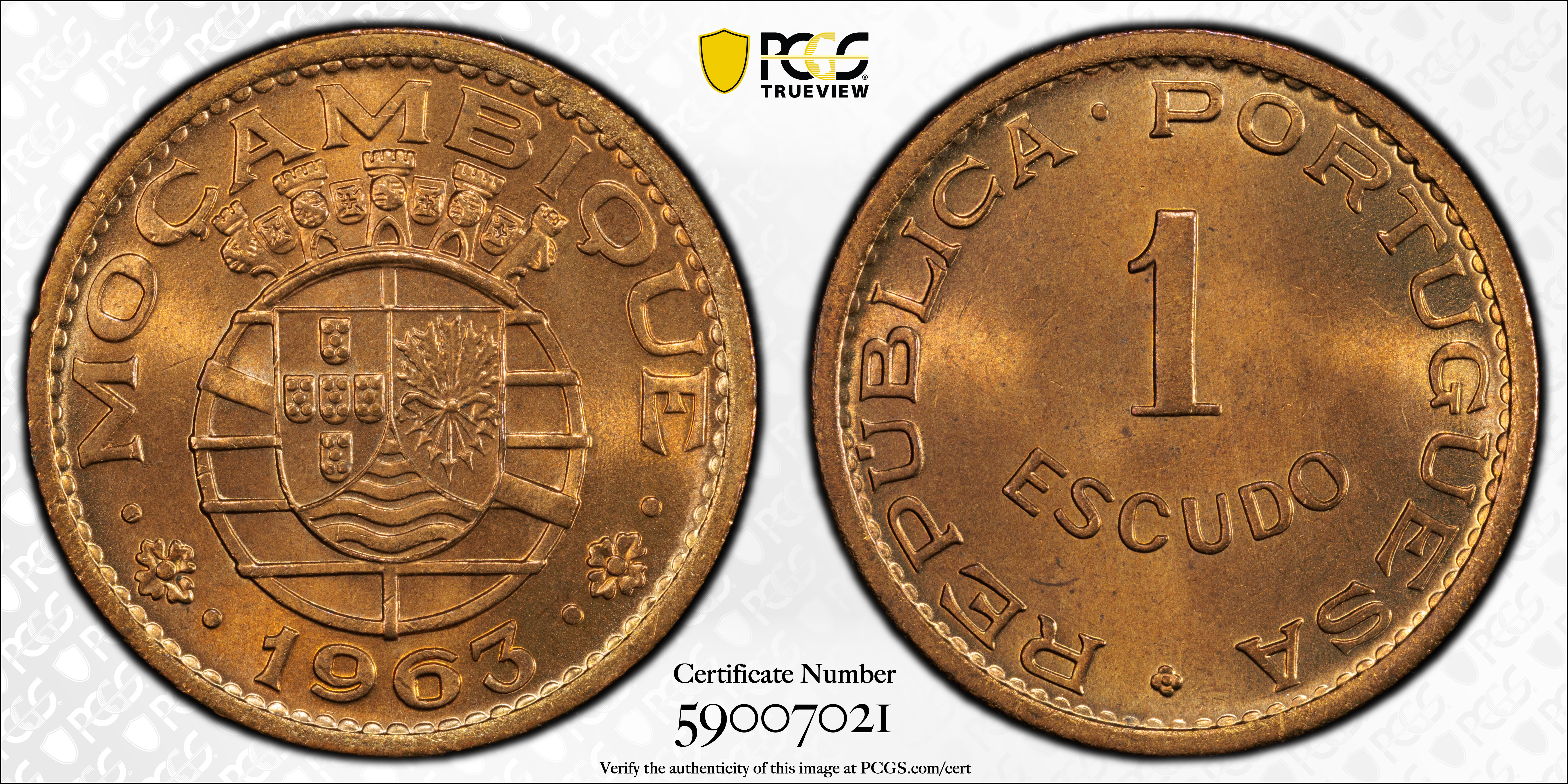 1963 Escudo, RD MS65RD Certification #59007021, PCGS #399028