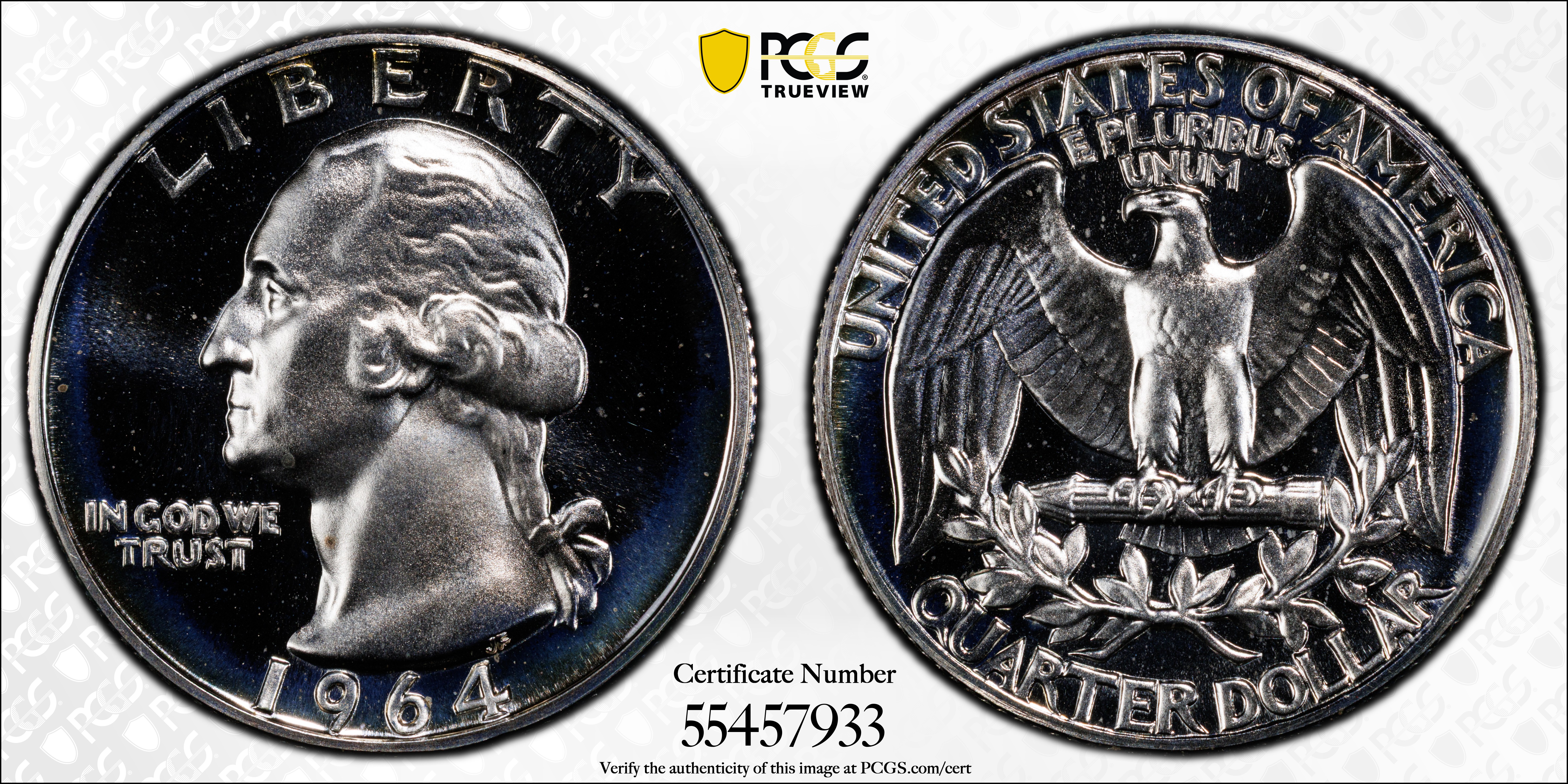 The 1964 Proof Washington Quarter is very common without Cameo or Deep Cameo surfaces in most grades and easily affordable up to about PR68 condition.