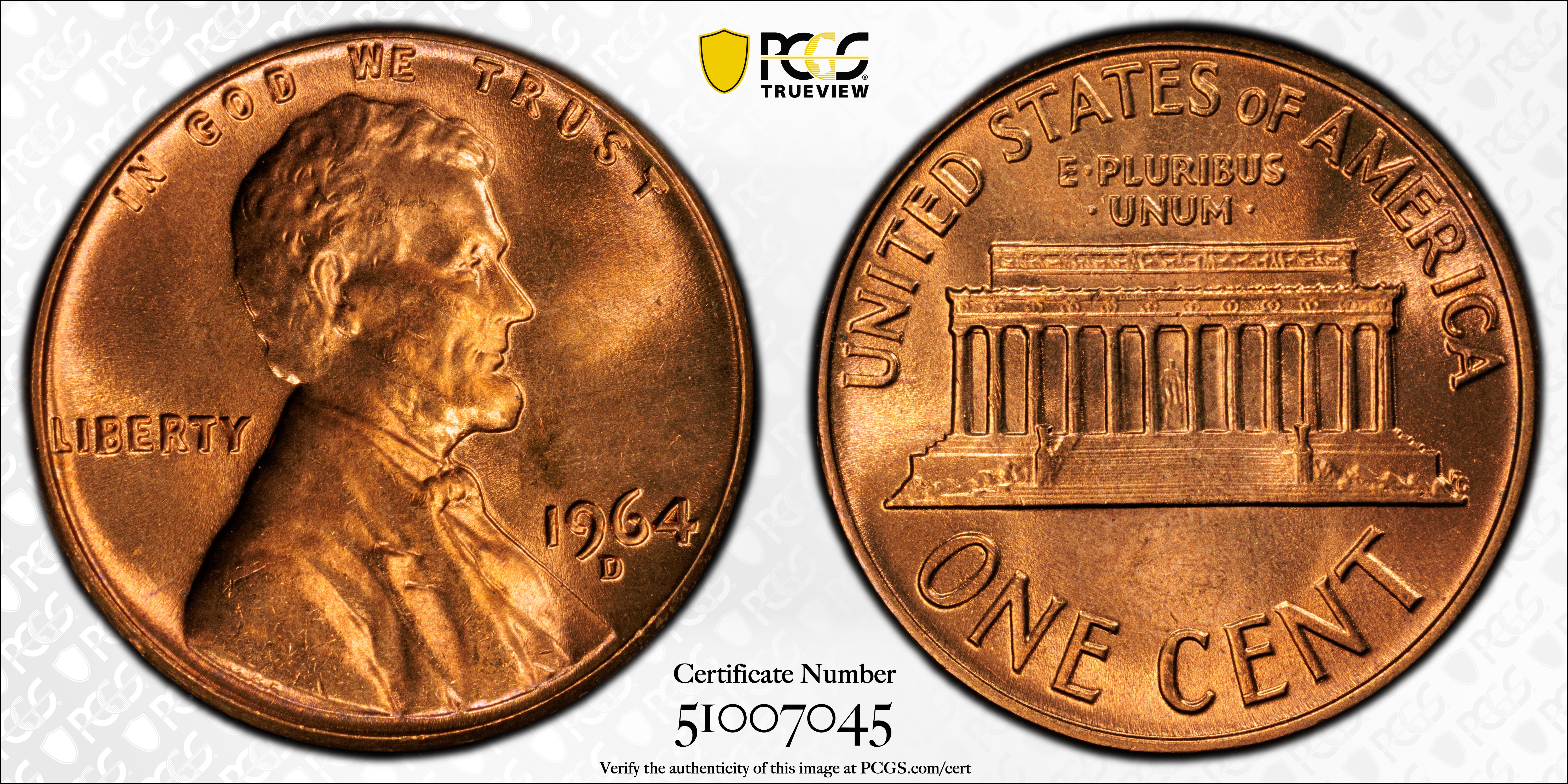1964-D 1C, RD MS67RD Certification #51007045, PCGS #2893