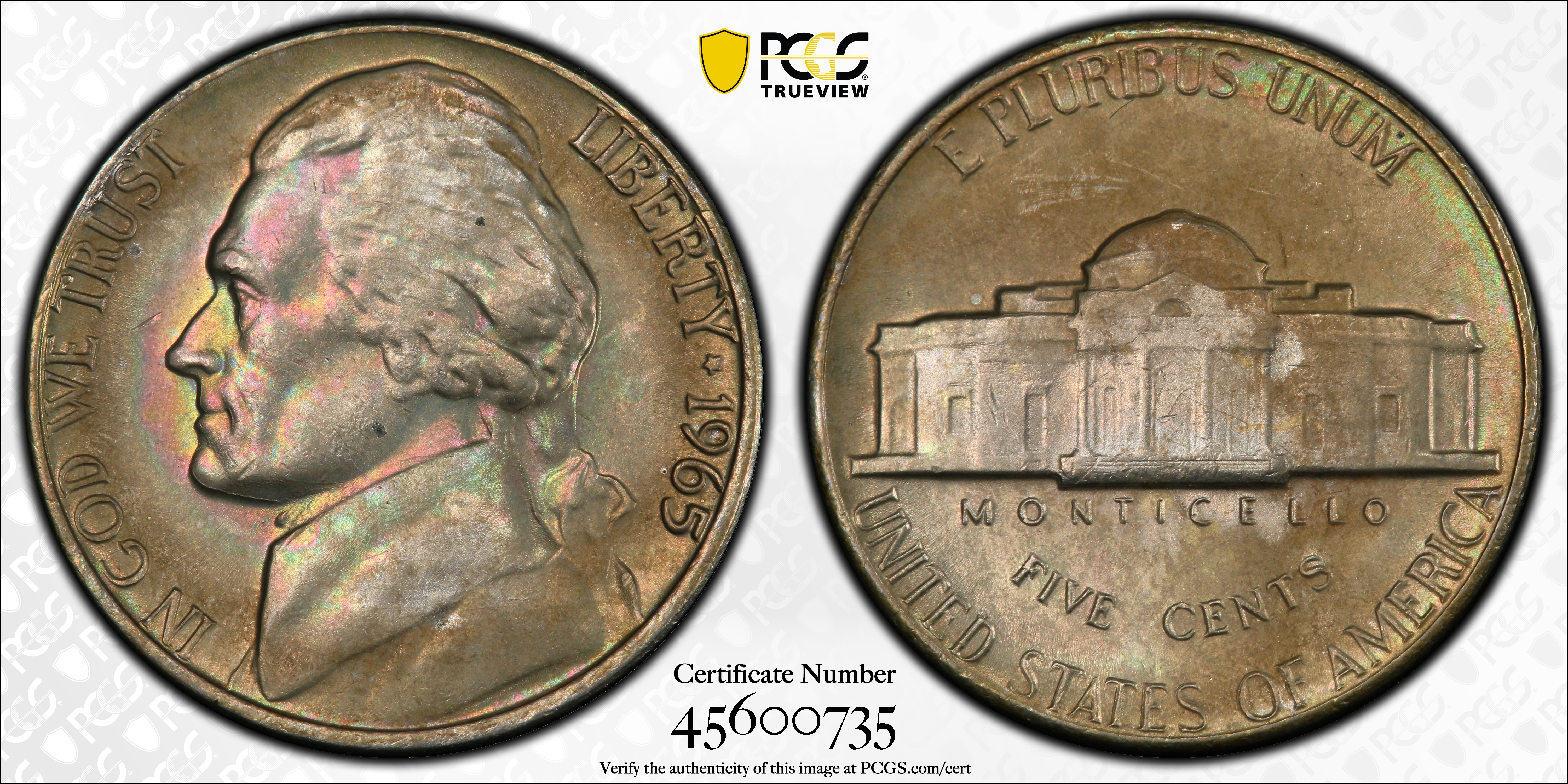 The 1965 Nickel is a very common coin in all grades, including Gem Mint State. However, any 1965 Nickel with Full Steps is an extreme rarity. The finest non-Full Step 1965 Nickel certified by PCGS is a single MS67.