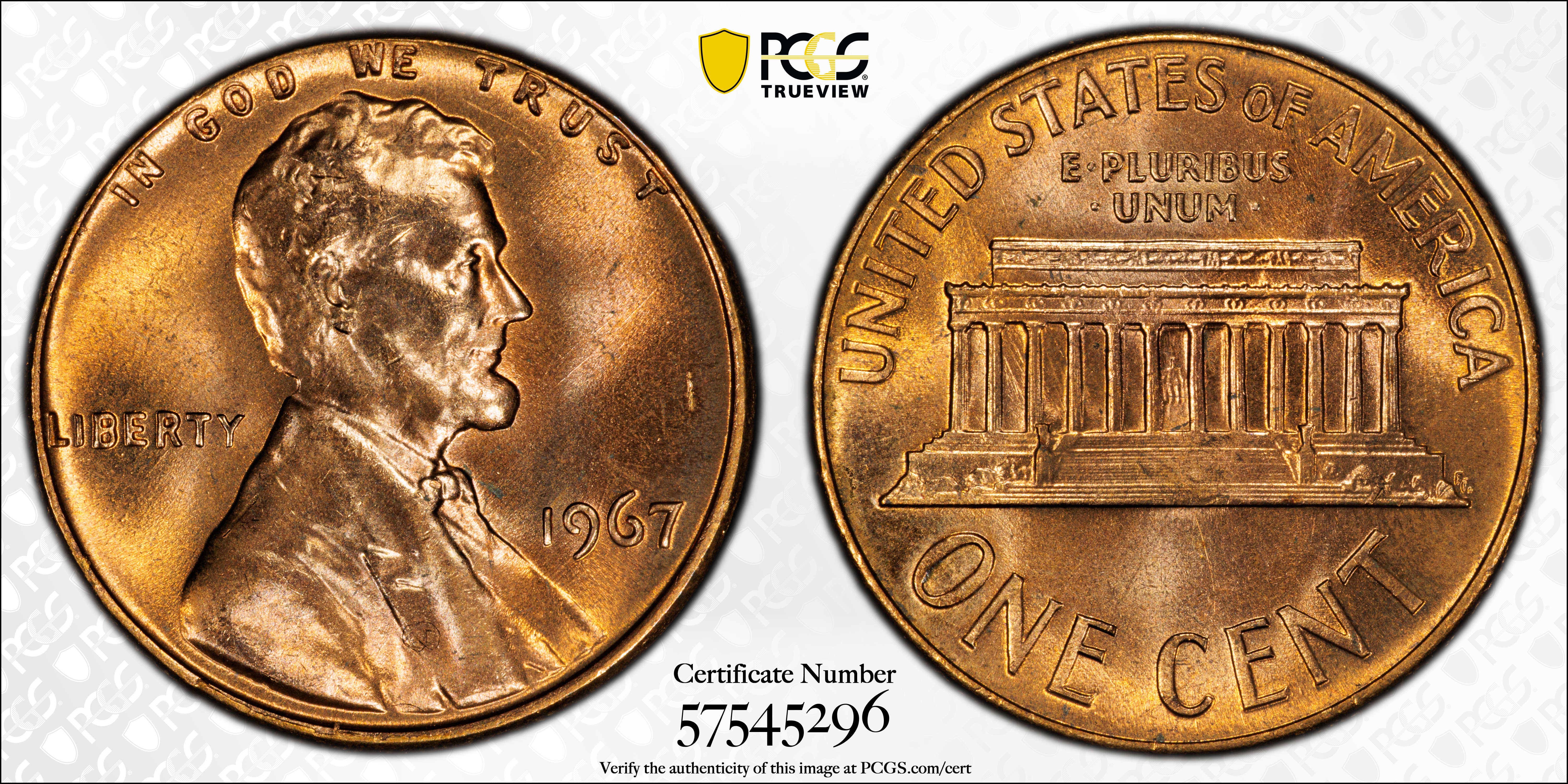 1967 1C, RD MS67RD Certification #57545296, PCGS #2902