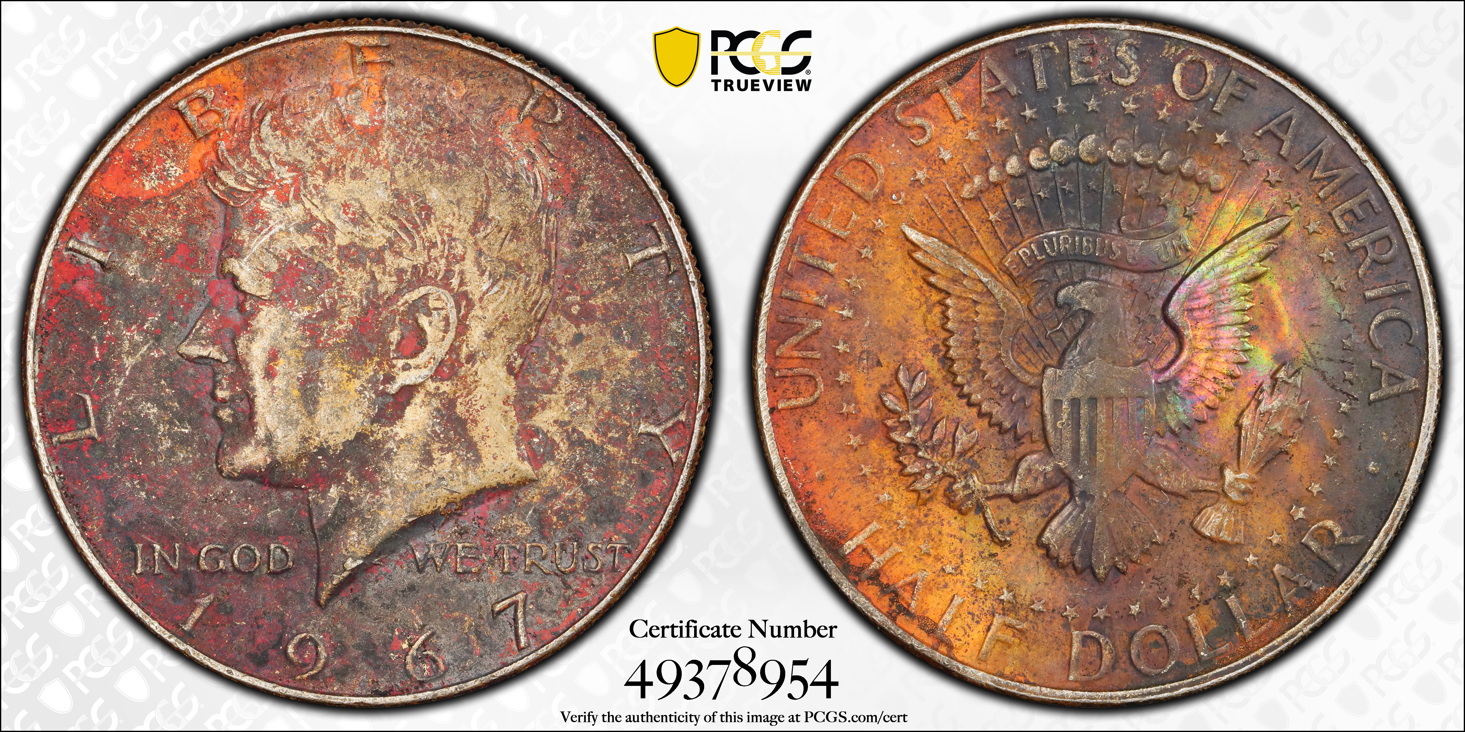The 1967 Uncirculated Kennedy Half Dollar does not contain a mint mark. The Mint intentionally left mint marks off coins produced between 1965-1967 to prevent coin hoarding. Kennedy Half Dollars stuck from 1965-1970 were composed of Silver and Clad content. The 1967 Kennedy Half Dollar has the largest mintage from all Uncirculated Kennedy Half Dollars produced from 1965 to 1970.