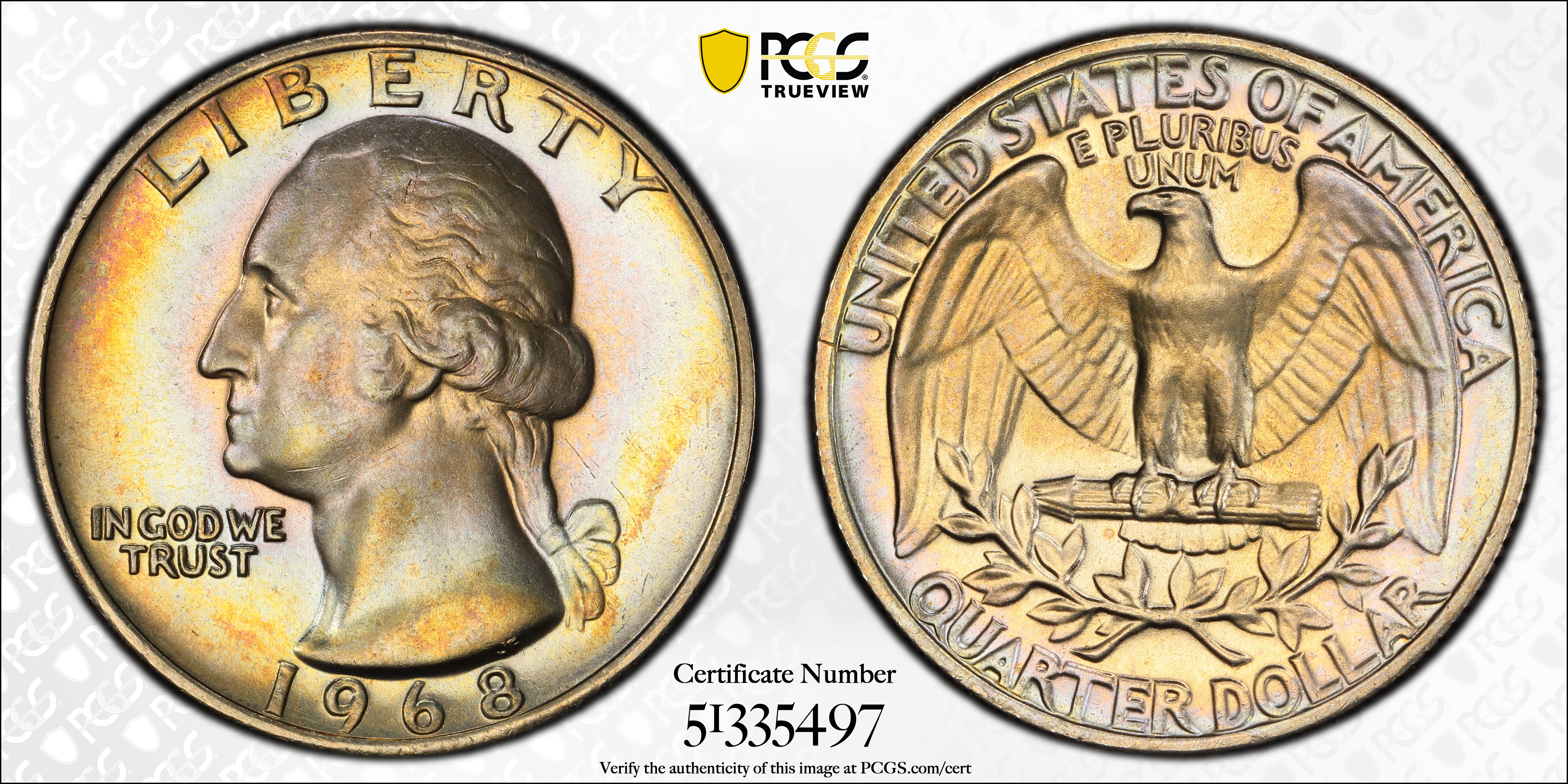 The 1968 Washington Quarter has a very large mintage making it easily obtainable from circulation in circulated grades. In uncirculated grades it is also easily obtainable in MS60 to about MS65 condition. Examples in MS66 are scarcer but can be purchased at a small premium. In MS67 condition it is really tough to find with many examples being graded and sold at a significant premium but probably still hundreds of examples are out there. In MS68 condition it is truly scarce with less than handful of examples known and none being known in finer condition.