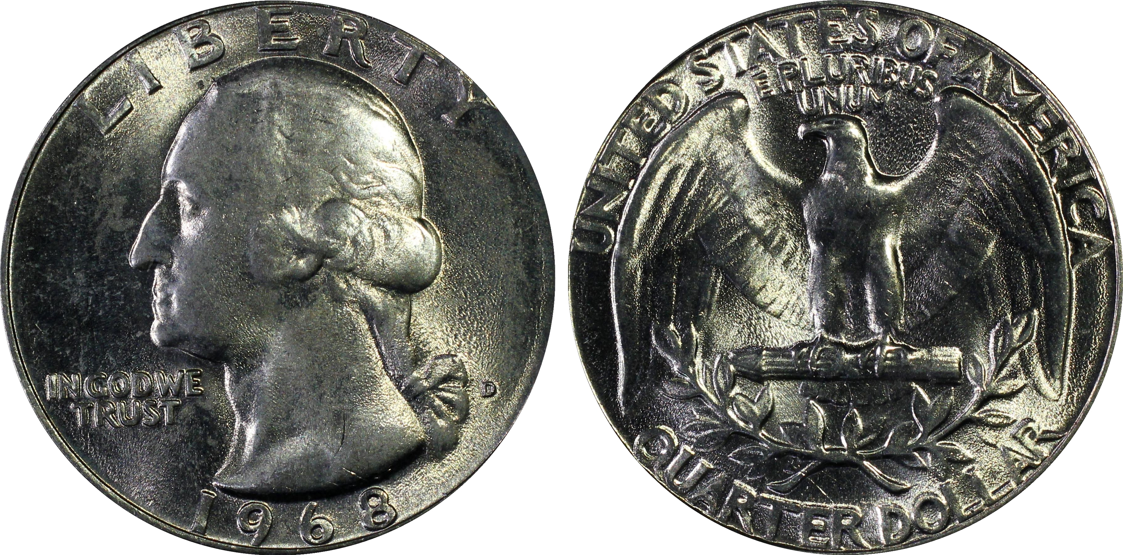 The 1968-D Washington Quarter has the lowest mintage for any circulation strike Quarter struck from 1965 to Date. Although it has the lowest mintage it is still fairly common and examples can still be found in circulation. Uncirculated examples can also be purchased inexpensively up to MS65 grades. In MS66 grades examples are usually pulled from rolls or sold as singles. in MS67 condition they are scarce with about 200 to 300 examples known. In MS68 condition they are almost unheard of with less than a dozen examples available and none being graded finer.
