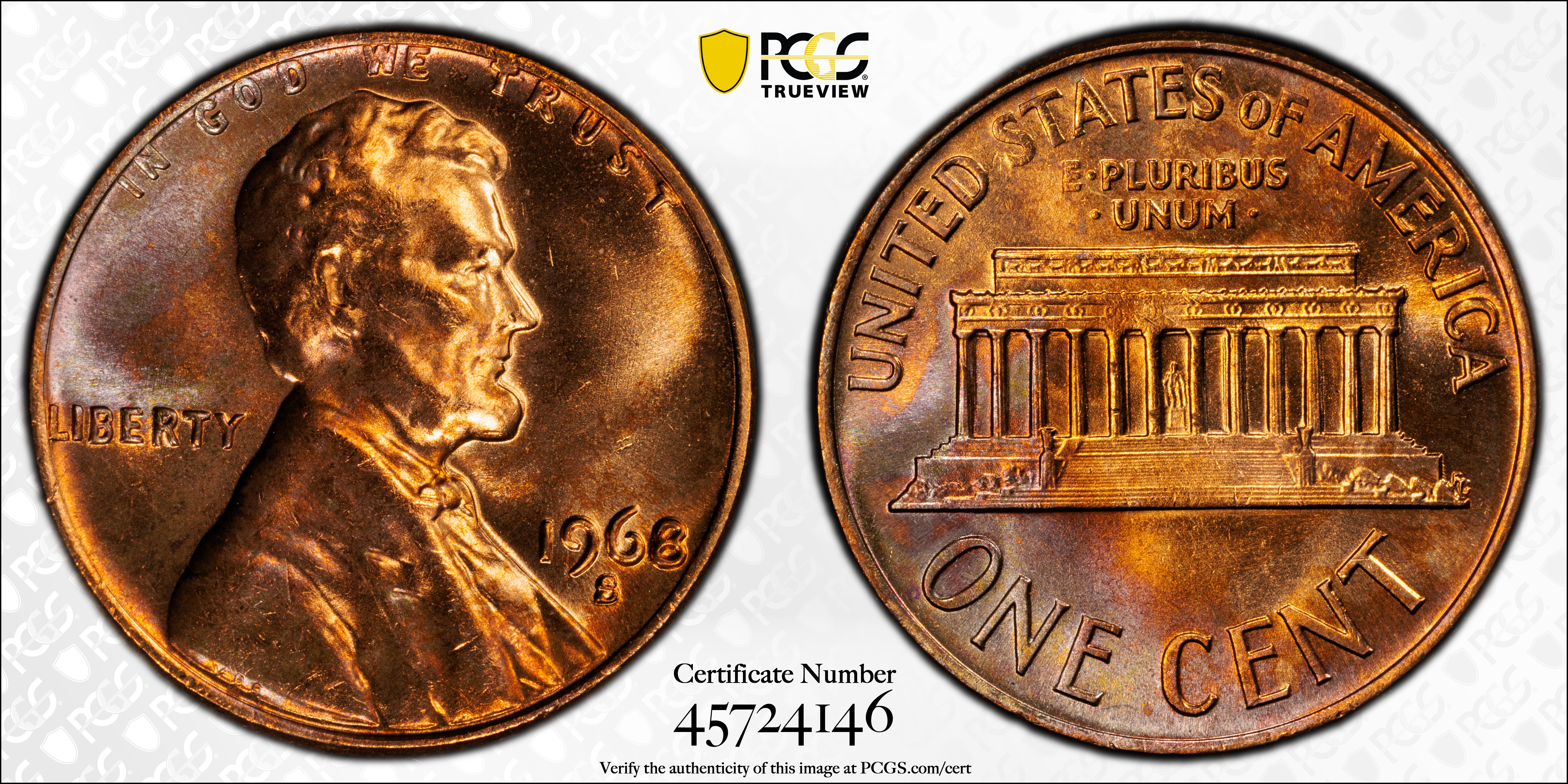 1968-S 1C, RD MS67RD Certification #45724146, PCGS #2909