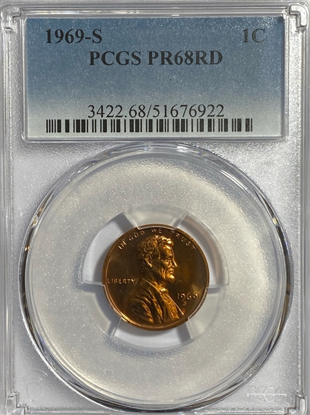 1969-S 1C, RD PR68RD Certification #51676922, PCGS #3422